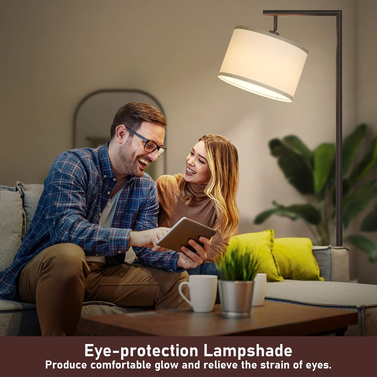 Q: What décor styles does this brown floor lamp complement?A: With its minimalist design, 90° arched top, and white fabric shade, this brown floor lamp blends seamlessly with various décor styles, making it versatile for use in living rooms, bedrooms, or offices.