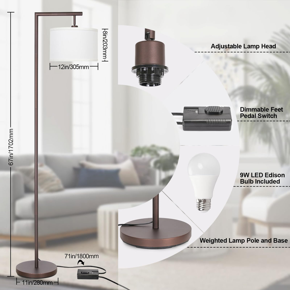Q: How does the dimmer switch work on this floor lamp?A: This floor lamp features a convenient foot-operated dimmer switch that allows you to adjust the brightness from 0-100% with a simple push of your foot, eliminating the need to bend down or manually adjust the switch.