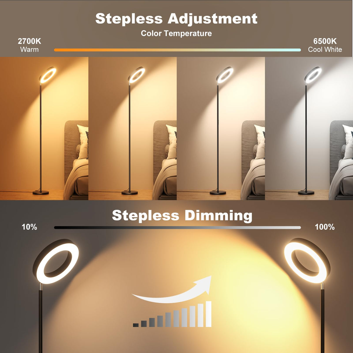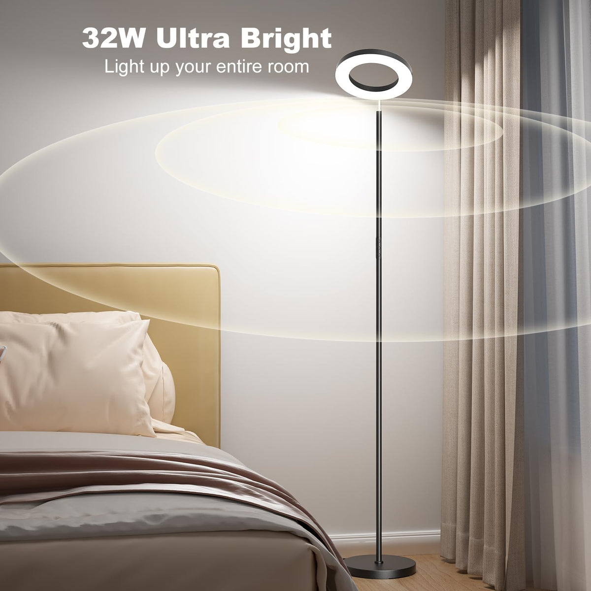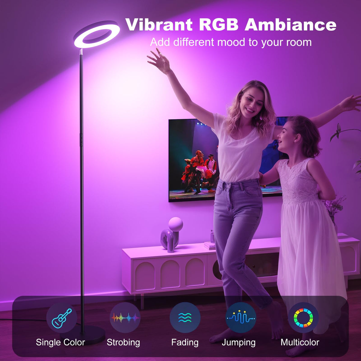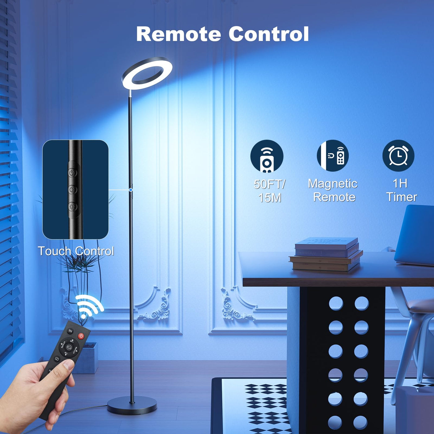 Q: What are the main features of the FULSUNT 32W RGB Floor Lamp?A: The FULSUNT 32W RGB Floor Lamp boasts a modern ring-shaped design, vivid RGB lighting scenes for various ambiances, stepless dimming from 5% to 100%, an adjustable lamp head, and two control methods (remote and touch). It is perfect for living rooms, bedrooms, offices, and entertainment spaces.