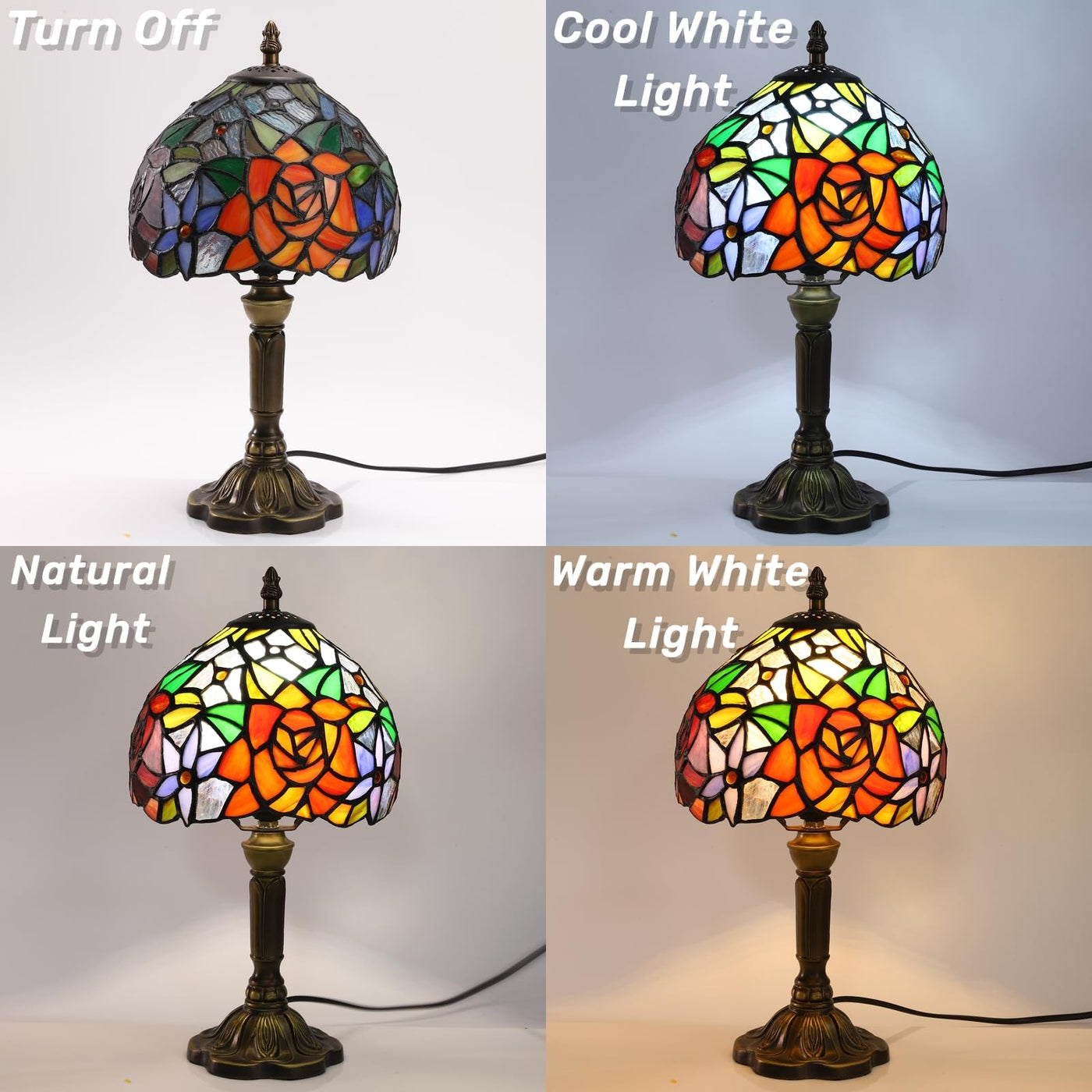 Q: What are the color temperature options for the FUMAT Rose Tiffany Table Lamp?A: The FUMAT Rose Tiffany Table Lamp comes with three color temperature options, allowing you to choose between warm white, cool white, and natural daylight settings to create the perfect ambiance for any room.