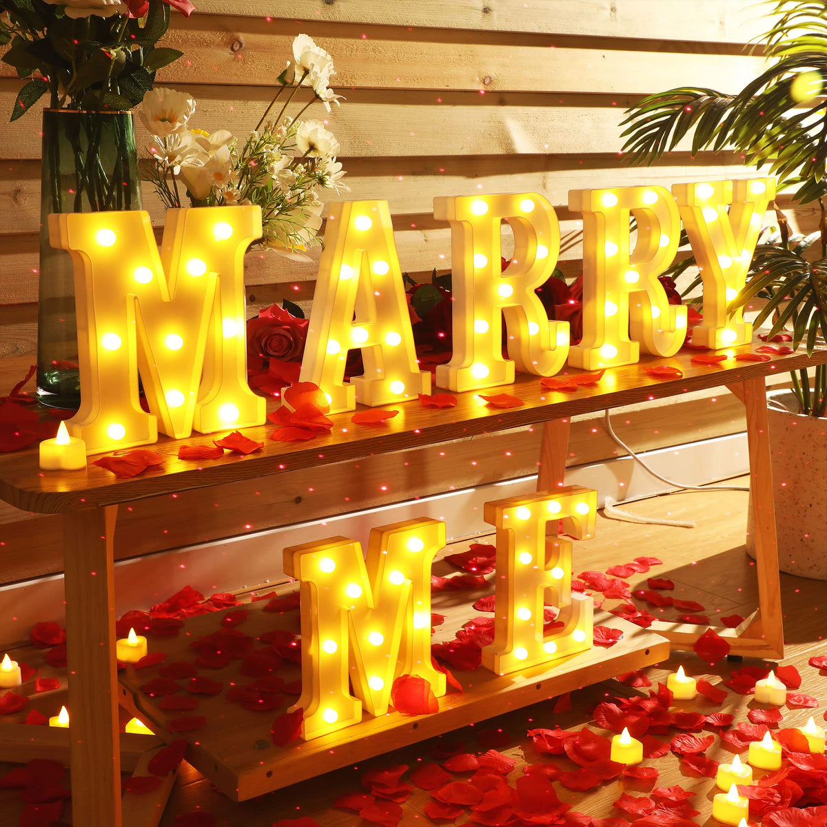 Q: How do I power the Marry Me Letter Lights and tea candles?A: The lighted 'Marry Me' letters are powered by batteries (not included), while the tea candles come with their own batteries, making them easy to use without needing a power outlet.