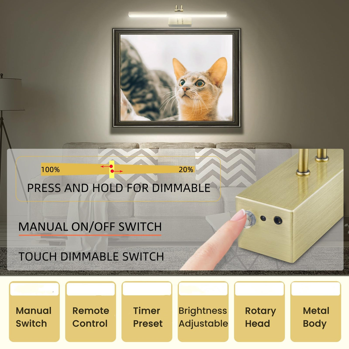 13inches Wall Wireless Remote Control Picture Lights for Paintings with Dimmable and Timer Function 1. Remote Control- ON/OFF button, 20%-100% stepless dimming, 1,2,3,4 hours timer function 2. Rechargeable- Recommended charger: 5V/2A, charging time: 5-6H 3. Adjustable Brightness: The brightness is stepless dimming to any levels you would like 4. Easy to install- The art light comes with a mounting bracket, just need to secure the bracket with included screws,then hang on this light on bracket 5. Wide application- Suitable for bedroom, reading,office, picture display, gallery etc 6. Our lights can serve as painting lights, art lights, gallery lights, display lights, picture frame light, dartboard light, photo lights, bath mirror light, wall art lights, bookcase lighting, artwork lighting, accent lighting for pictures. More Details: Wattage: 3W Lumen: 280LM Color Temperature: Warm white light Battery: 3.7V 5000mAh battery Charging: Blue indicator will flash Full Charged: Indicator will stop flash Packing List: - 1 x Portrait Lights for Wall Pictures - 1 x Mount Bracket - 1 x USB Charging Cable - 2 x Screws - 1 x Remote Control - 1 x User Manual
