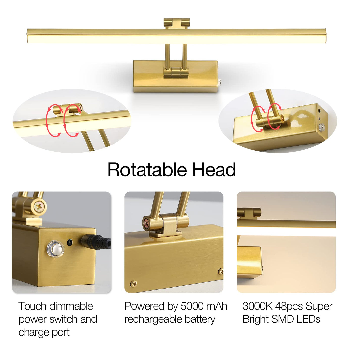 Q: What are the key features of the FUNCHDAY Wireless Picture Light?A: The FUNCHDAY Wireless Picture Light features a 5000mAh rechargeable battery, 48 super bright LEDs with 3000K warm white light, and a dimmable function that allows you to adjust brightness using a remote control. It also has an adjustable arm that can rotate 150° and 300° to direct light exactly where you need it, and a timer function that can set the light to turn off automatically after 1, 2, 3, or 4 hours.
