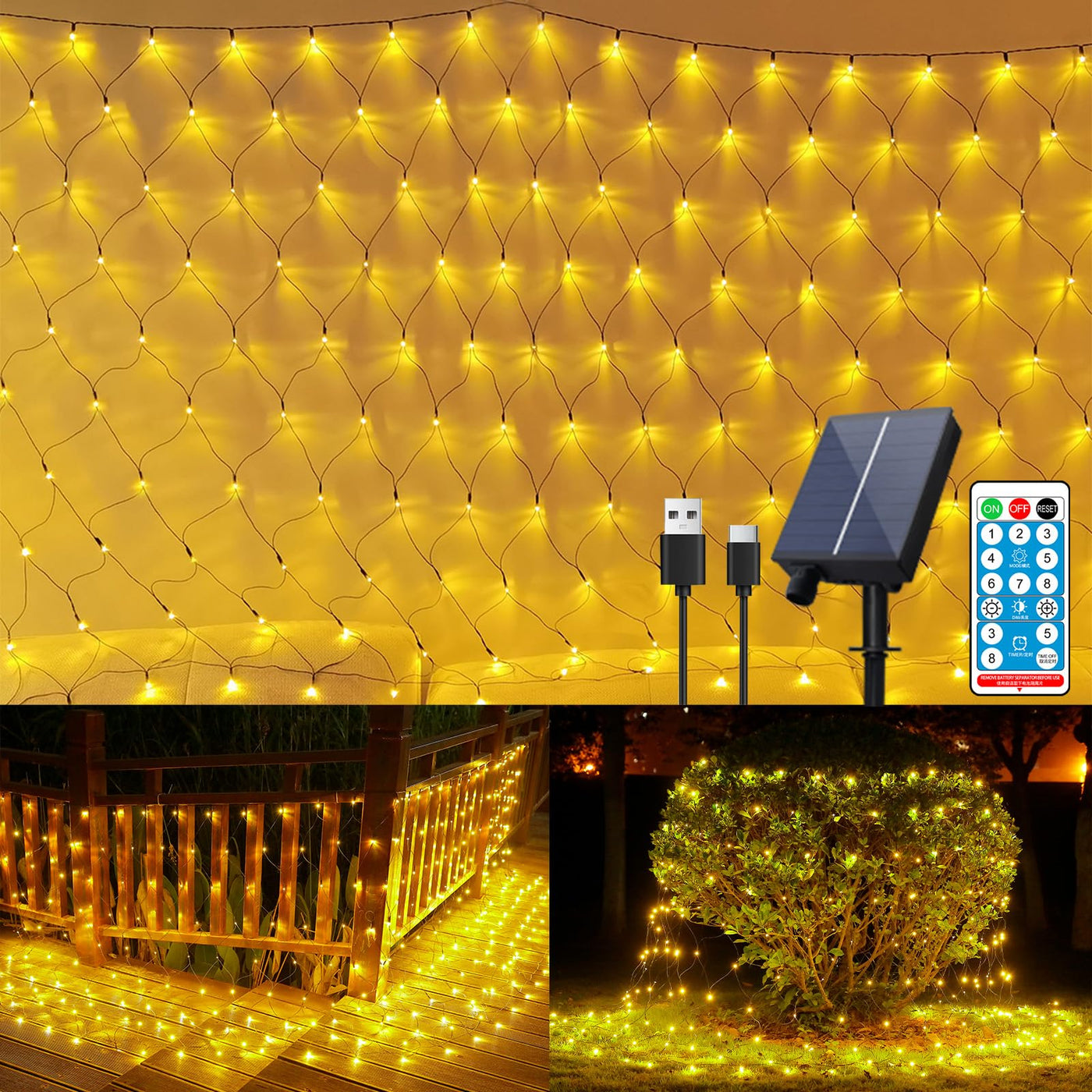 Q: What are the power options for the Solar Net Lights?A: The Solar Net Lights can be powered by solar energy or USB. The solar panel charges during the day and automatically lights up at night, while the USB option allows you to charge the panel during cloudy or rainy conditions.