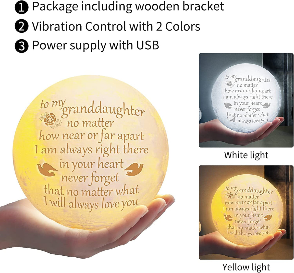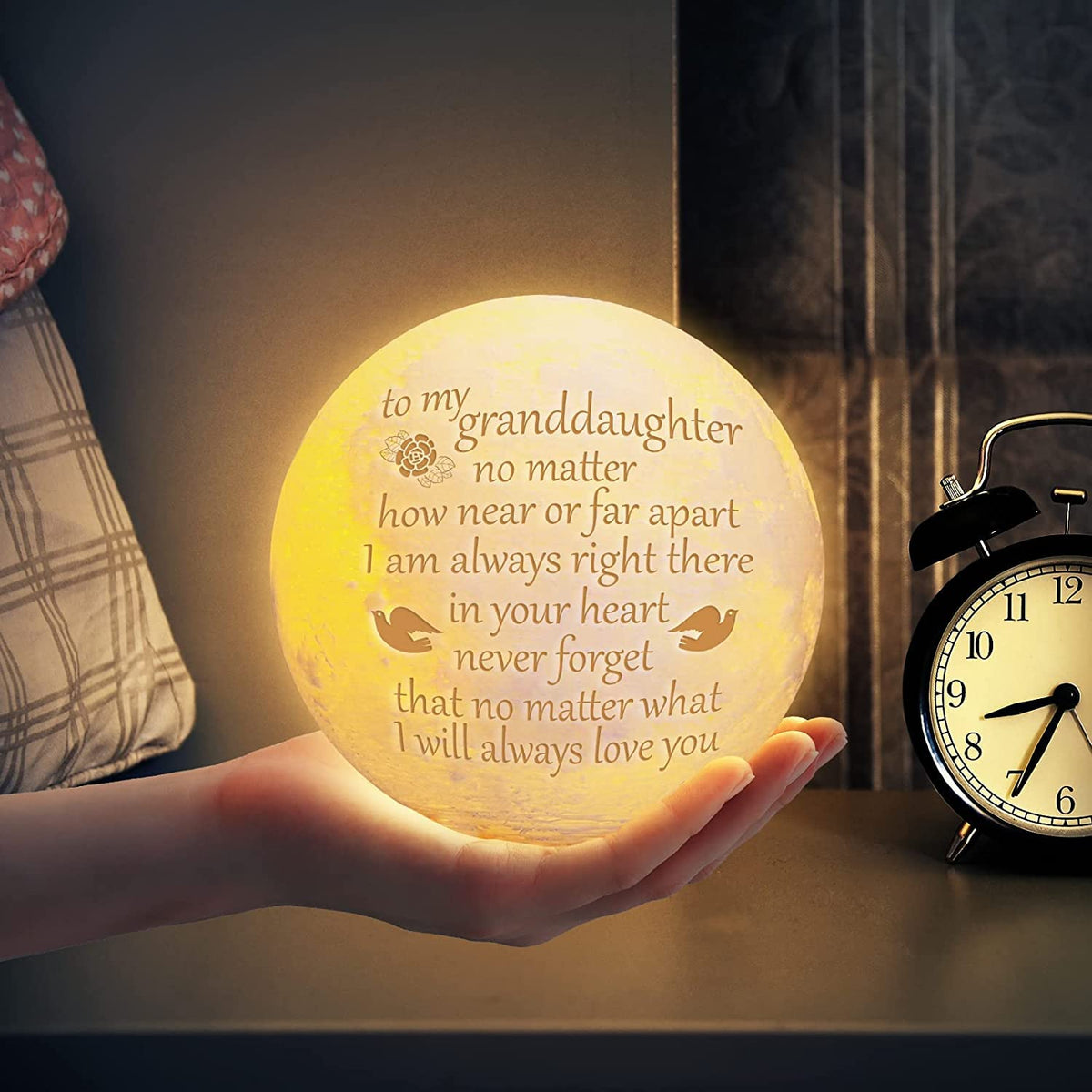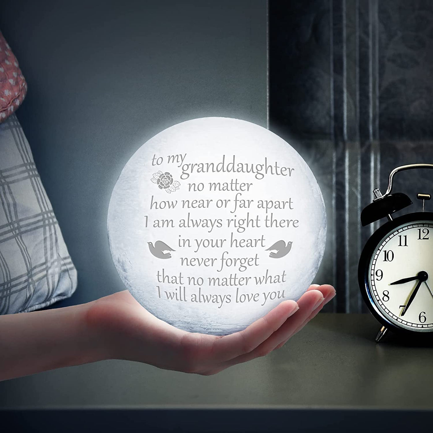 IT IS NOT JUST A NIGHT LIGHT! The Engraved Moon Lamp is a perfect gift to express your love for your granddaughter. No big grand gesture, no huge expense, do the FUNNLI MOOM LAMP get your love across loud and clear. It will bring back amazing memories when your granddaughter uses it every time. ROMANTIC DECORATION The Moonlight is dreamlike and warm. Just put the lights in the corner of the house, no matter the living room, the bedroom, or the study, you can create a dreamy and romantic atmosphere for your house. At the same time, it is perfect for different occasions such as a courtyard, dinner table, pathways, parties, etc. Highlighting the taste and improving the quality of your life.