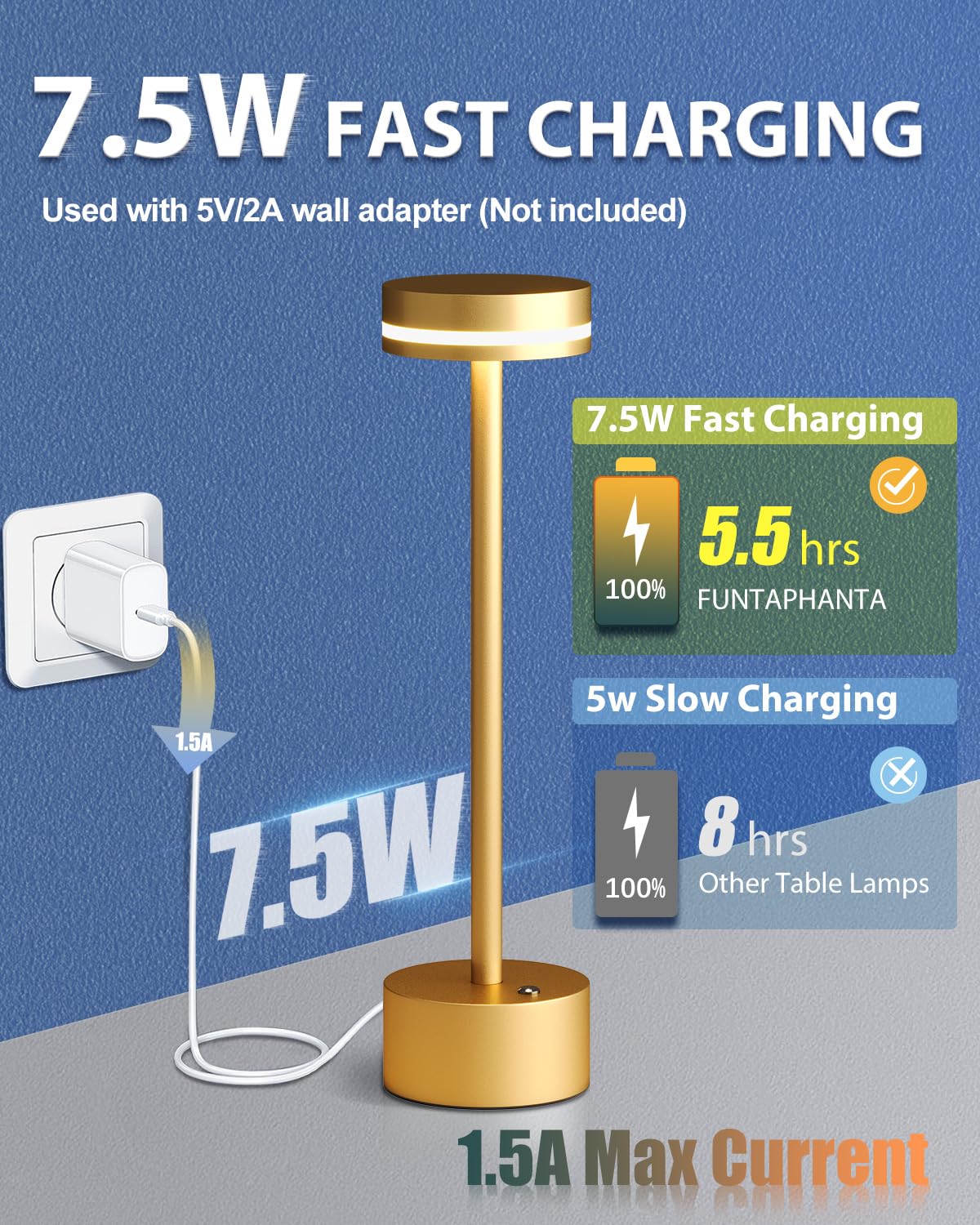 Q: How long does the battery last on a full charge?A: The FUNTAPHANTA table lamp is equipped with a built-in 4000mAh lithium battery that provides 8 to 48 hours of usage on a full charge, depending on the brightness setting used.