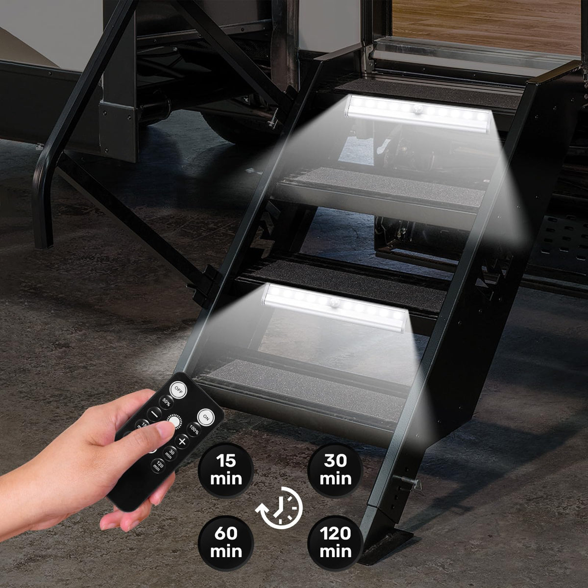 The Fymblin RV Step Lights are crafted from well-made aluminum, ensuring durability and resistance to wear over time. Each unit is powered by 4 x AAA batteries (not included) and features a user-friendly remote control, allowing you to easily turn the lights on or off, adjust brightness levels, and set timers for automatic operation. With a compact size of 7.5 inches, these lights can be conveniently installed anywhere you need additional illumination.