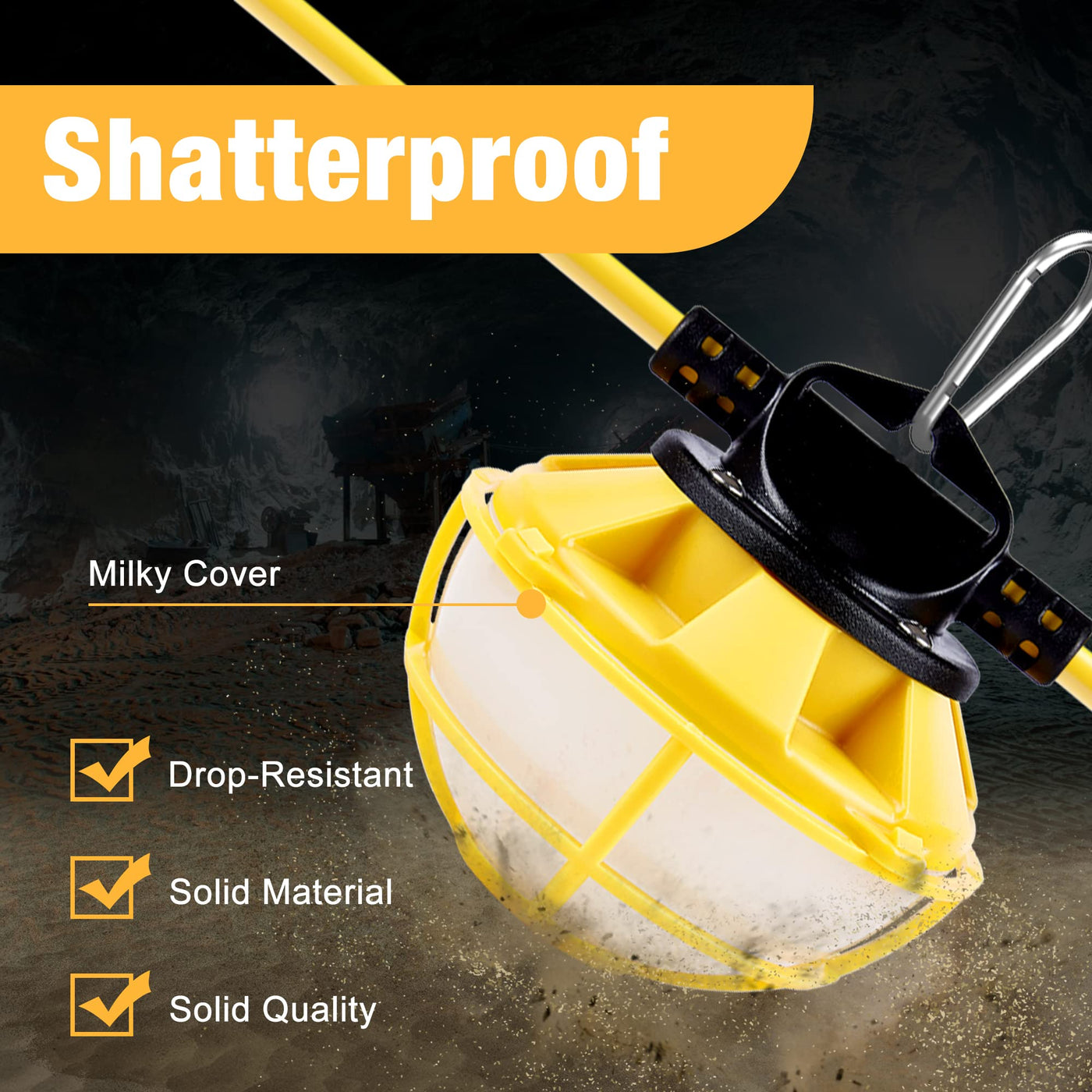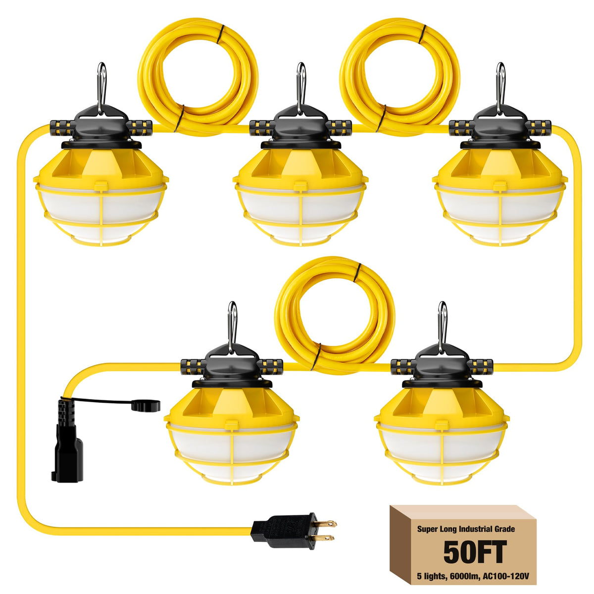 This Led Construction String Light 50FT 6000LM 50W Led String Work Light with 5 Bulbs Jobsite Lighting Outdoor Construction Temporary Work Lights ETL Certified 5000K 5 lights per bunch for option. Suitable to different demand of distant. Light heads spaced 5 feet/3mts apart, same to traditional string work light. Each lamp with metal hook, flexible for easy intallation. Misty PC cover protect eyes better, anti-dazzle design. Over 50000 hours lifetime and offer 5 years warranty. ETL/cETL/CE/RoHS certificates
