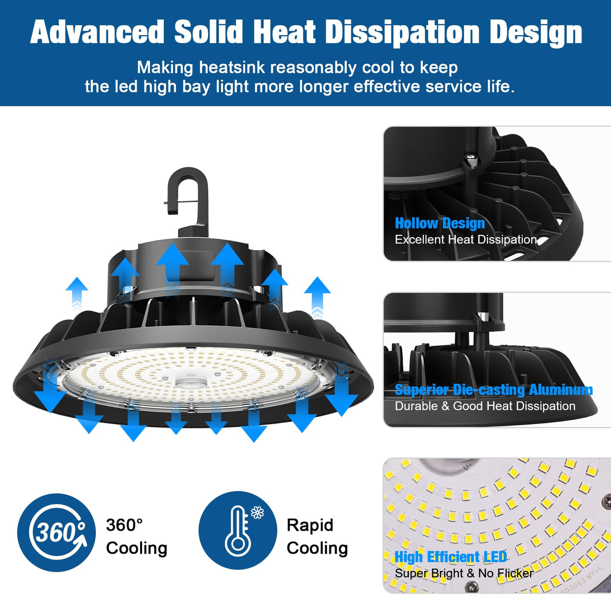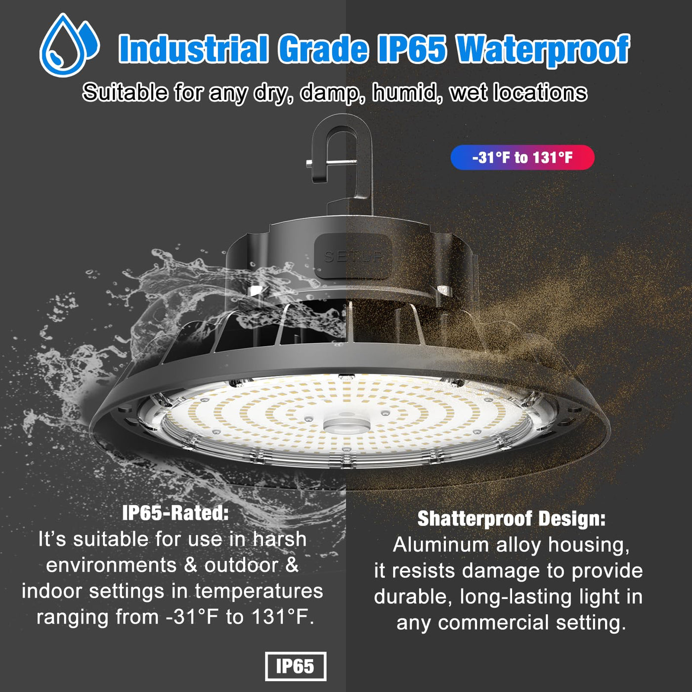 Why Choose Our Products: We Are A Company Specializing In The Research And Manufacture Of Lamps. And Have Compliance, Complete Manufacturing Scale And R&D Team. We Provide A 5-Year Warranty. Features Of Ufo High Bay Light: Durable Ring Hook: We Also Provide A Durable Round Ring Hook To Help You Get This Bay Light Installed More Quickly And Conveniently. You Can Hang The Light Lamp To Anywhere You Want As Long As You Can Hang The Ring Hook To Something. 5Ft Power Cable: The Special Outer Casing Hollow Design Can Provide An Amazing Heat Dissipation Effect To Ensure Much Longer Effective Working Time Of The Led High Bay Light. Fan-Shaped Surface Design: The Aluminum Die-Casting Heat Sink, Provides An Amazing Heat Dissipation, Ensure A Long Lasting Lifespan Of The Light. Dimmable: With The 1-10V Dimmable Bay Light Led, You Can Adjust The Brightness To Meet Your Needs. Surface Electrostatic Spraying Process: No Rust, High Temperature Resistance, Corrosion Resistance. Safety Rope: With A Safety Cable To Make The Luminaire More Stable And Safe. Ip65 Waterproof: Suitable For Wet And Damp Locations. What'S In The Box 100W 5000K Dimmable High Bay Lighting 5' Cable With 110V Plug Ring Hook Safe Rope Specification: Power: 100W Lumen 14000Lm Color Temperature: 5000K Waterproof: Ip65 Lifetime: 50,000 Hours Beam Angle: 120? Input Voltage: Ac 100-277 V Color Rendering Index (Cri): >80