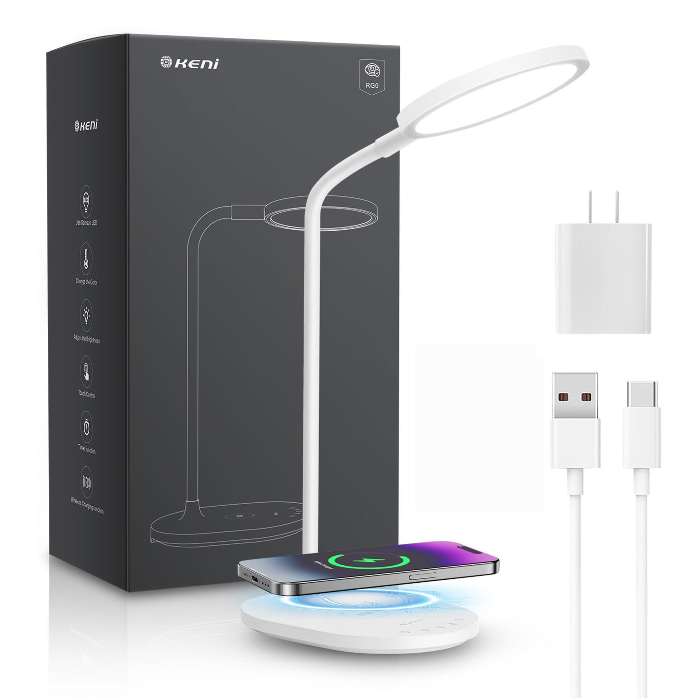 G Keni LED Desk Lamp with Wireless Charger, Touch Control Dimmable Desk light, 3 Color Modes, Brightness, 30 Minutes Auto Timer, Eye Care Table Lamp with AC Adapter for Home, Office, Study, Reading, High Lumen