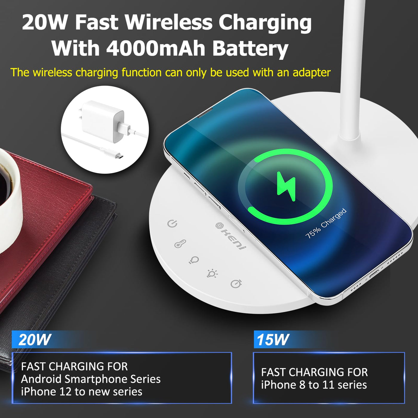 G Keni Ultra Bright Cordless Desk Lamp With Wireless Charger For Home Office Dorm, 4000Mah Dimmable Bedside Reading Desk Lamp Wi