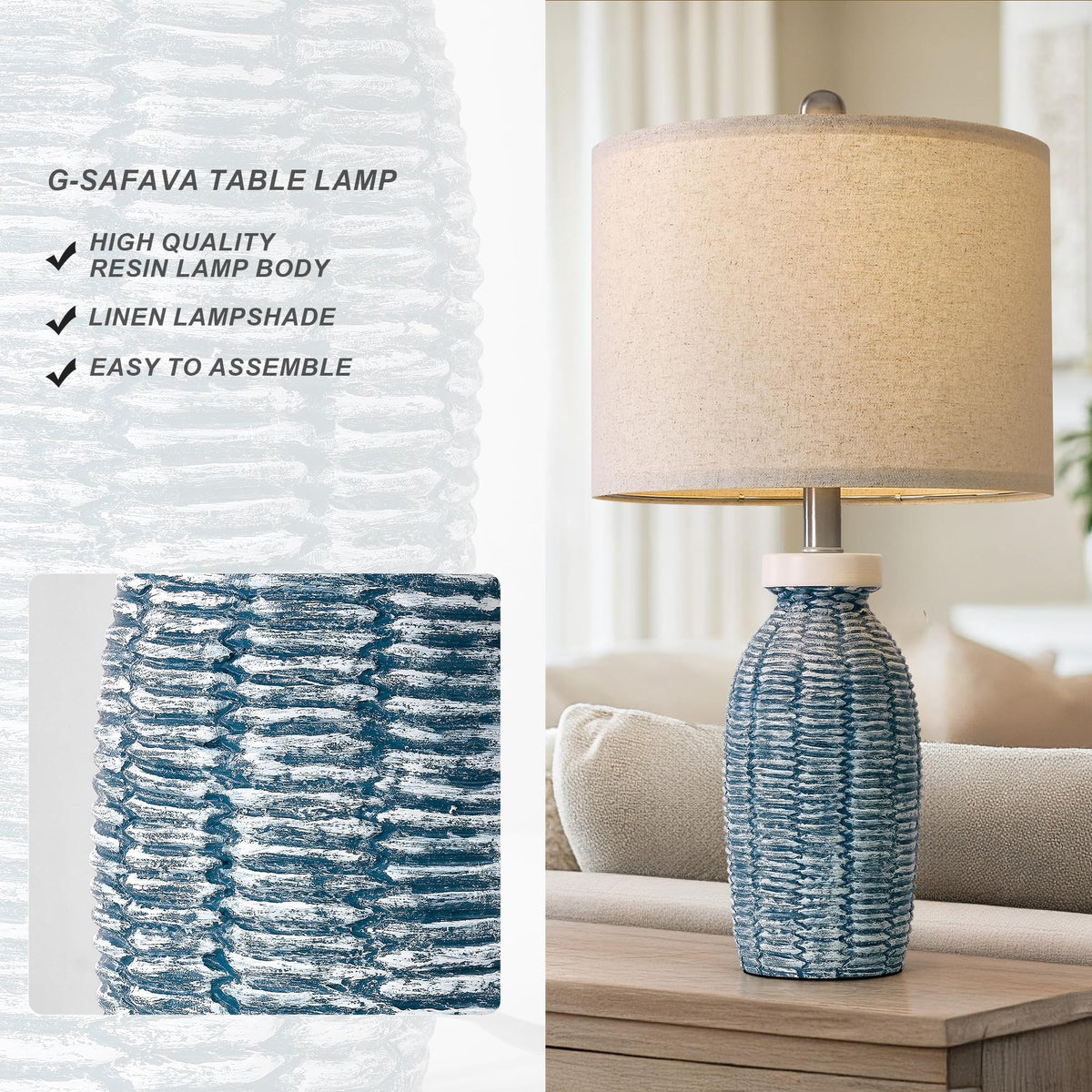 - Q: What materials are used in the construction of the G-SAFAVA lamps? A: The G-SAFAVA table lamps are crafted from durable resin, ensuring long-lasting beauty and functionality, making them a reliable choice for your home.