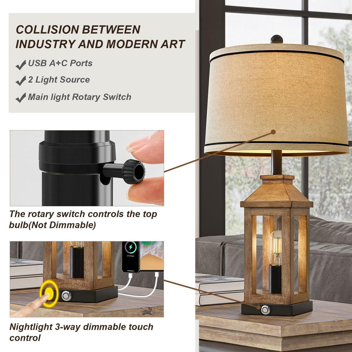 G-Safava 23.75'' Farmhouse Table Lamps Usb A+C Charging Ports 3-Way Dimmable Touch Control Lamp Nightlight Vintage Modern Lamp F