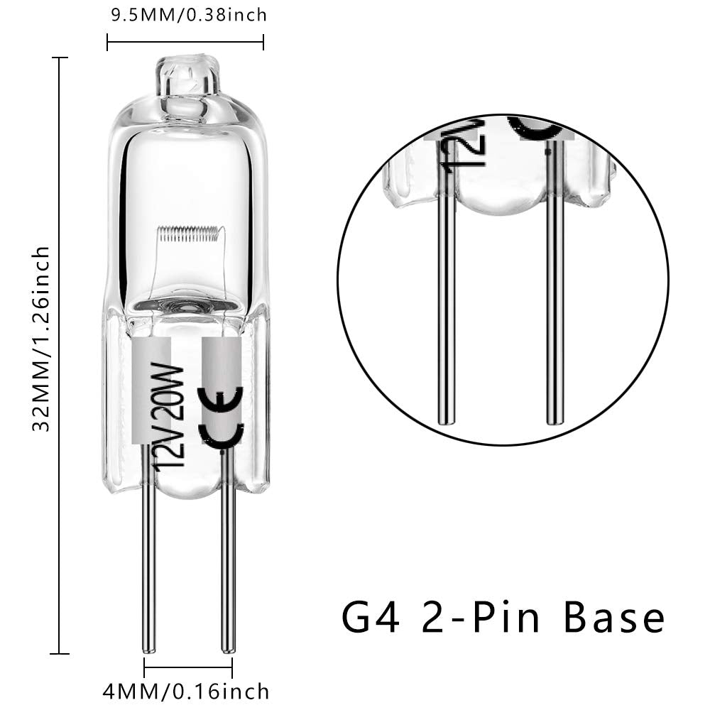 - Durable Standard Size: Each bulb has a diameter of 0.38” (0.95cm) and a length of 1.19” (3.0cm), featuring a G4 bi-pin base (4mm or 0.16” apart). This standard sizing ensures compatibility with a variety of fixtures.