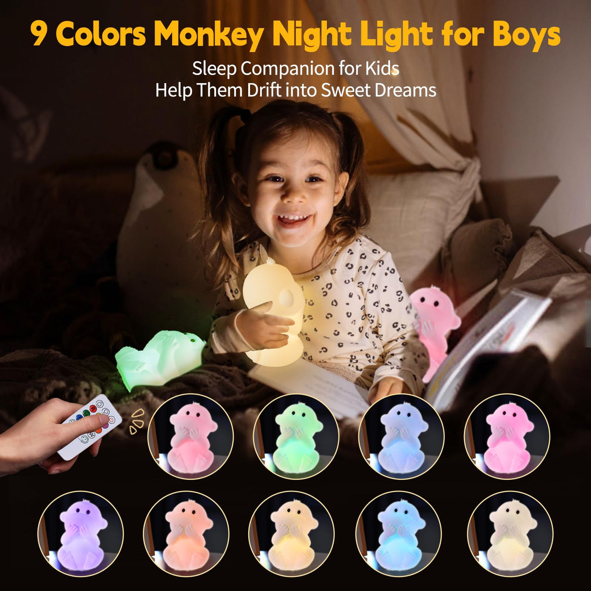 ?Monkey Gifts?Animal night light is perfect as a new playmate for kids. Its ideal for a kids night light, room decor, and as a birthday, Christmas gifts. The tap night light creates a warm and comforting atmosphere, helping children feel safe and relaxed. This adorable night light also serves as a great companion for bedtime stories and sweet dreams. | ?Color Change & 15/30/60 Timer ?Cute monkey night light lamp has 8 colors and fun color cycling modes, making it the perfect toy for kids. Its 15/30/60 timer and sleep light(breathing light) mode help children fall asleep easier, relieving parents of worries about playful children staying up late | ?Remote & Tap Control?The remote control allows your child to choose modes remotely, or tap the kids nightlight to adjust the brightness | ?USB C Charging and Portable?The portable nursery night light uses a USB-C cable for charging. When fully charged, it can provide up to 5 hours of operation at maximum brightness and up to 50 hours at minimum brightness | ?Cute Squishy Lamp?The GAGBC animal toddler night light comes with a remote control and a USB-C cable.The baby night light is cordless, so babies can cuddle with the adorable monkey night light for sleep. If youre looking for kawaii night lights, funny night lights, Cute Lamp. Monkey is an ideal choice! Let the cute monkey night light be your kids sleep companion