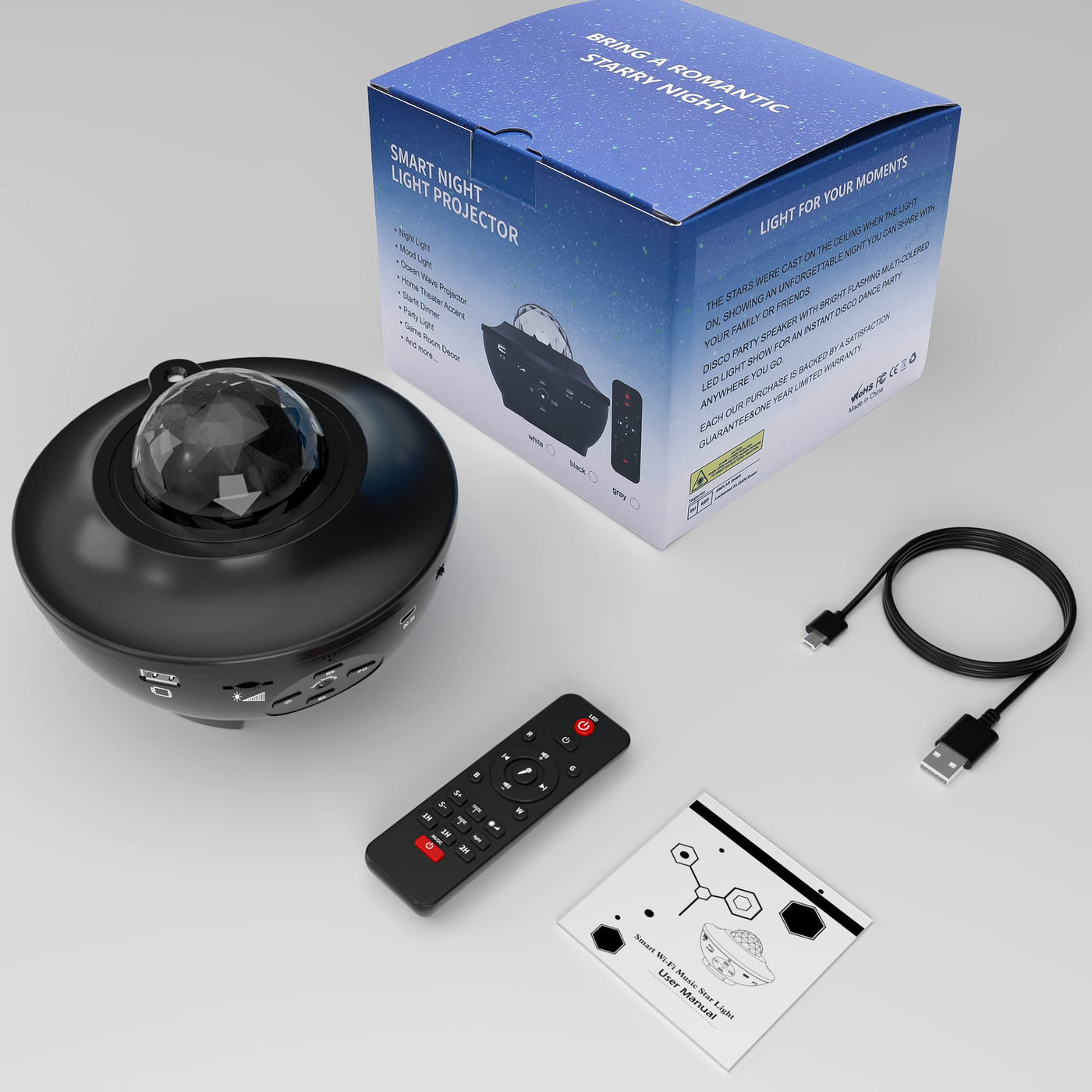 3 in 1 Star Projector, Galaxy Projector with LED Nebula Cloud/Moving Ocean Wave Projector for Kid Baby, Built-in Music Speaker, Voice Control, Multifunctional for Christmas/Bedroom/Game Rooms/Home Theatre/Room Decor/Night Light Ambiance ? Features Input: DC 5V/2A LED Power: 2*3W Music: USB, Bluetooth USB Input: power bank, computer, AC adapter ? 10 Colors and Three Dynamic Visual Projections Single (Red, green, blue and white) or mixed colors can create 10 different star projections. You can freeze your favorite colors combine with stars to create a relaxed, romantic and different colorful atmosphere. ? Rotating Lighting Display The projector light could offer you a static or floating nebula display. No matter you want it to rotate dynamic or become static, just to change the rotating speed by remote controller. ? Music Player The night light projector has a built-in speaker so you can connect your phone Bluetooth or plug a USB flash dish in port to play your favorite song. ? Brightness Adjustable Just use the remote to choose the brightness you like. The brightness of light could be adjusted: 30%, 60%, 100%. ? 3 Timers Optional The star sky night lamp of dynamic nebula built-in 1H, 2H auto-off timer, the projection light will shut off automatically when it reaches the preset time. Or let it stay on all night to help you or your child to sleep better. ? Remote Control You dont need to worry about getting out of bed or sofa to turn on or off the night light, the remote also can control the night light, colorful lights, adjust brightness, freely turn on/off the lamp, change lighting mode, music songs, timer. ? Content Music Star Projector x1 Remote Control x1 USB Cable x1 User Manual x1