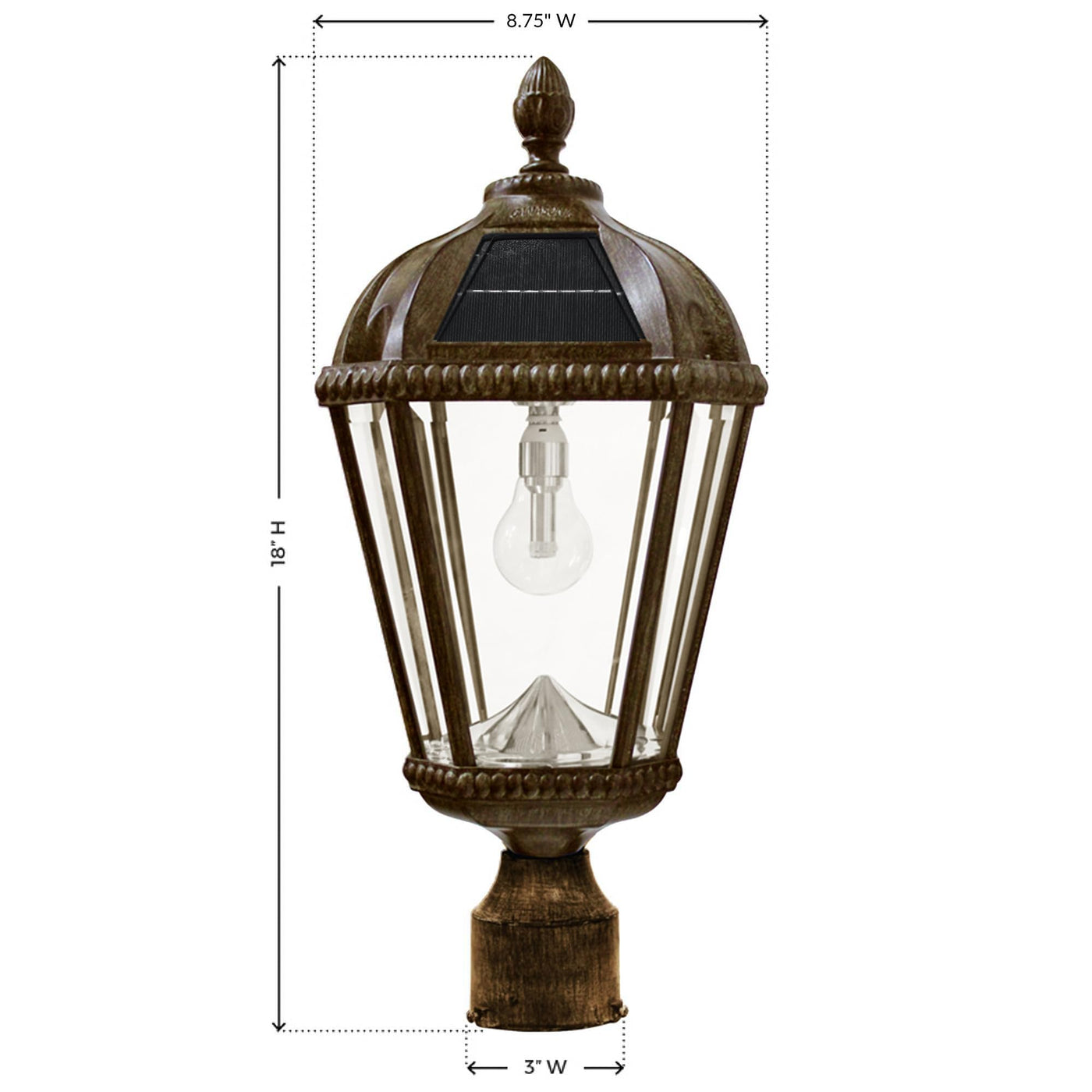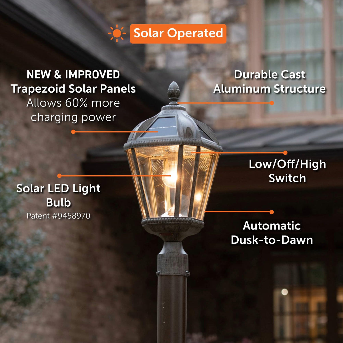 The GS-Designs by GAMA SONIC Royal Bulb 98B312 is a single lamp head solar outdoor post light that features an attractive design inspired by New Orleans architecture. This solar post light comes with all necessary hardware for mounting and can be placed on any 3 in. outside diameter pole or 3 in. pier/flat base. Stylish and easy to install, this light is the perfect solar lighting solution for your outdoor space. The Royal Bulb post light is constructed of weather-resistant, rust-resistant powder-coated brushed weathered bronze cast aluminum and beveled glass panes. This series incorporates our cutting-edge GS Solar LED Light bulb technology and provides 360 illumination. At dusk, the solar lamp post light automatically turns on and provides a brightness of 150 Lumens in a warm white (2700K) color temperature for up to 12-hours on a full charge. No wiring is needed. Just place this solar outdoor post light in a spot with ample direct sunshine and let the sun do the rest.