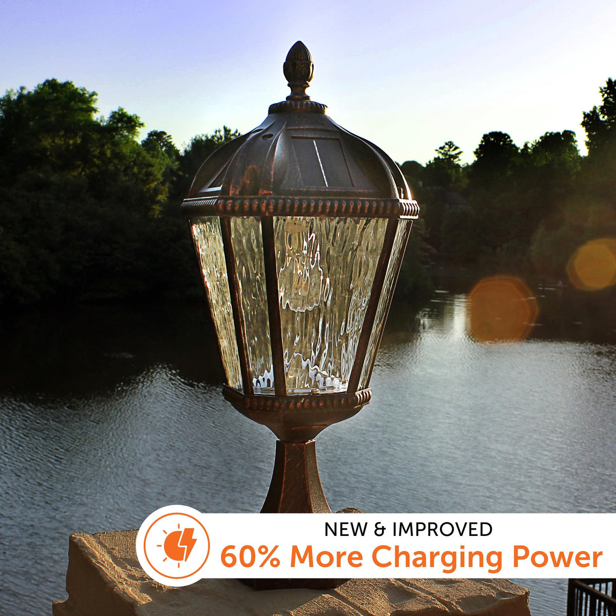 The Gama Sonic Royal Bulb GS-98B is a single head solar post light for a pier mount application. It is a rust-resistant, cast-aluminum solar pier mount lantern which features an attractive 19th-century lamp design and has now been integrated with our latest revolutionary technology: a patented outdoor Solar LED Light Bulb. This 23 in. tall solar flat mount post light with a powder-coated black finish will add style and distinction wherever its installed. Easy to install and providing ample light this solar post light is the perfect solar lighting solution for your outdoor space. Key Features and Benefits: Fully Solar Powered: Just set our Royal Solar Lamp at your desired location, and let the sun do the rest. Durable Solar Light: Weather resistant, rust-resistant powder-coated cast-aluminum solar post light. New Patented LED Solar Bulb Technology: solar LED light bulb provides 150 Lumens of powerful light. High / Low mode switch that extends nightly light duration up to 12 hours of operation on a full charge. Integrated Lithium Ion battery pack lasts for approximately 3 years (roughly 1000 charges) and can be replaced for additional 3 years of operation. Warm White Light: Our Royal solar lamp delivers warm white light, creating the natural look of incandescent light in a solar lamp setting.