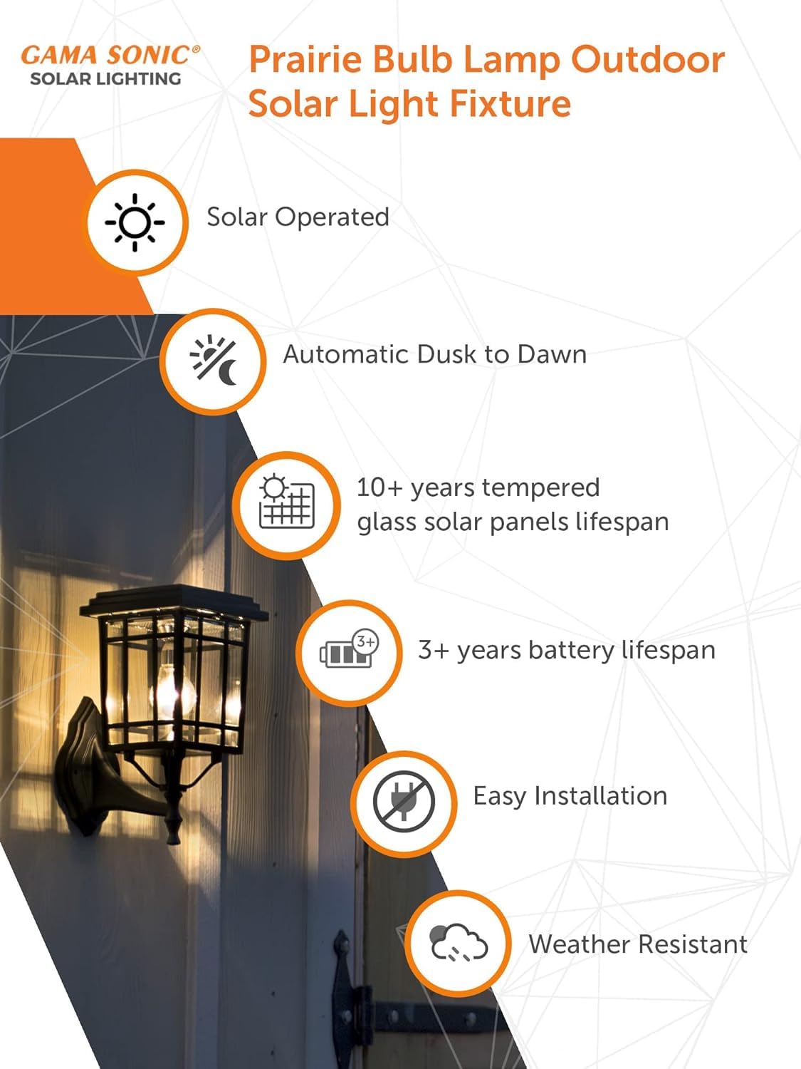 Q: What materials is the Gama Sonic Prairie Bulb Lamp made from?A: The Gama Sonic Prairie Bulb Lamp is constructed from weather-resistant and rust-resistant cast aluminum with flat grind glass panes, ensuring durability and longevity in outdoor environments.