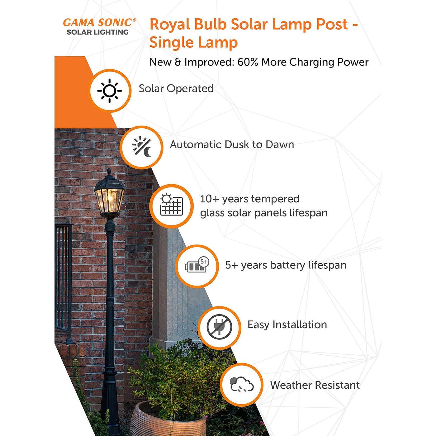 The Gama Sonic Royal Bulb is a single solar post light and lamp post kit. It is a rust-resistant, cast-aluminum solar lamp post which features an attractive 19th-century lamp design and has now been integrated with our latest revolutionary technology: A patented outdoor Solar LED Light Bulb providing 150 Lumens on a full charge. Standing 87 in. tall solar lamp post with a powder-coated finish in Black. The Royal Bulb solar lamp post and post light kit will add style and distinction wherever its installed. Easy to install and providing ample light this solar lamp post is the perfect energy and money-saving replacement for electric or gas-powered outdoor lighting.