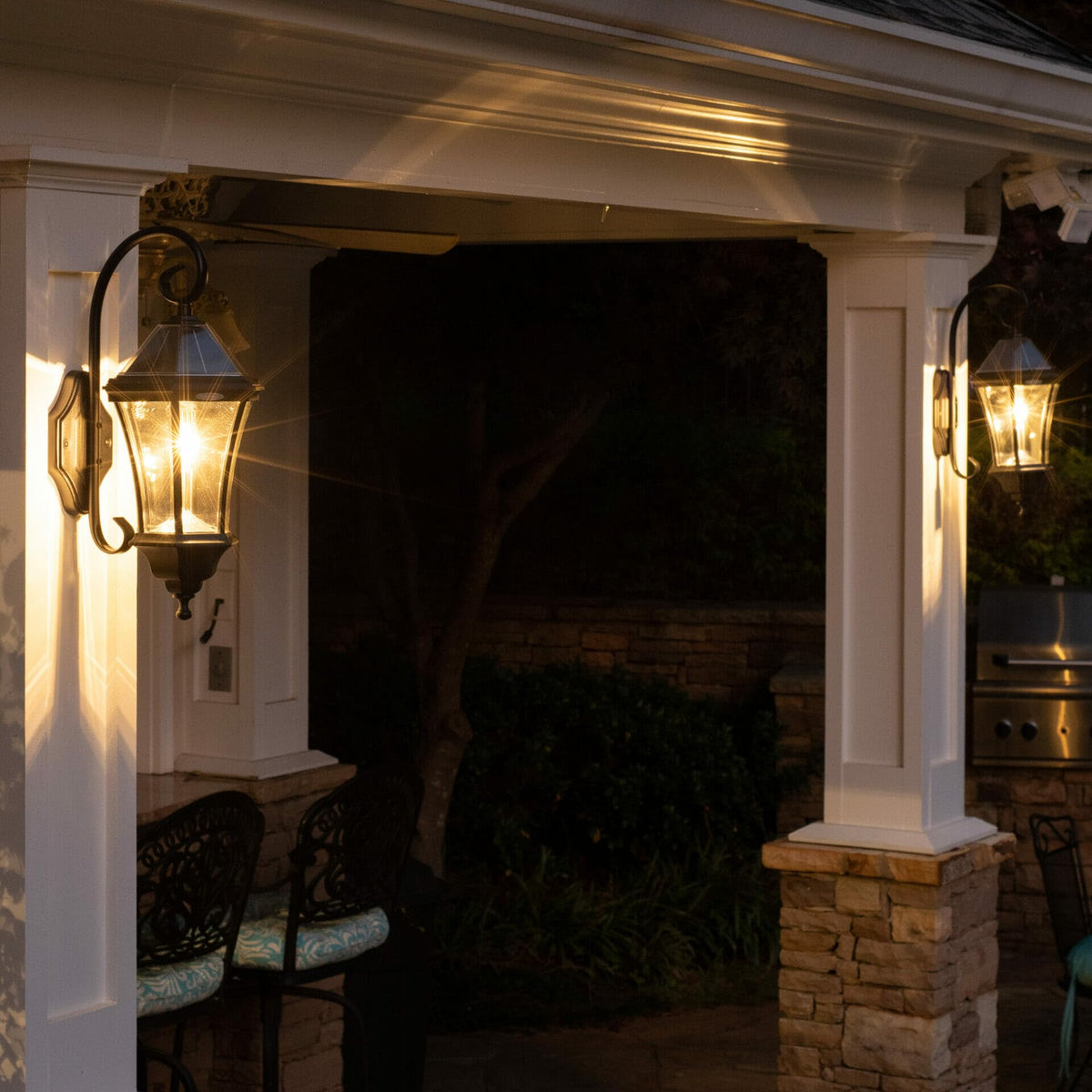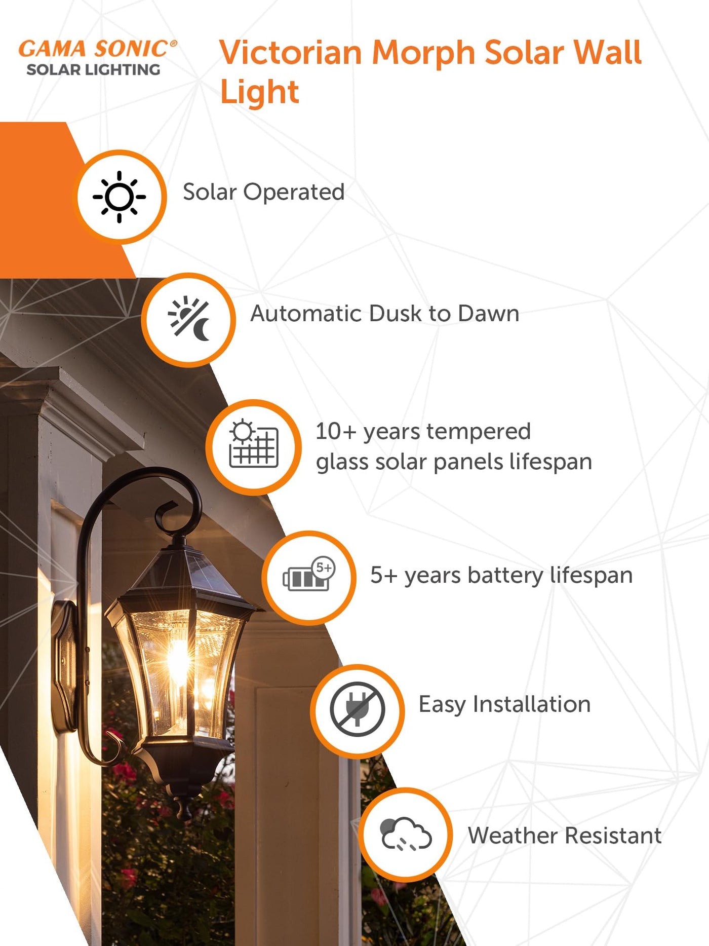 Q: How does the automatic dusk-to-dawn feature work?A: The Gama Sonic Victorian Solar Wall Light includes an integrated sensor that automatically turns on the light at dusk and off at dawn, providing energy-efficient lighting while enhancing security.