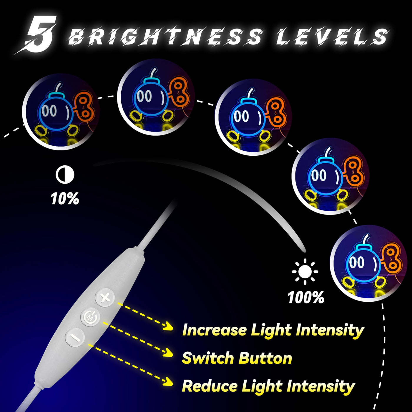 Q: What colors does the Gaming Neon Sign come in?A: The Gaming Neon Sign features vibrant colors including blue, orange, white, ice blue, and yellow, allowing you to choose the perfect hue to match your decor.