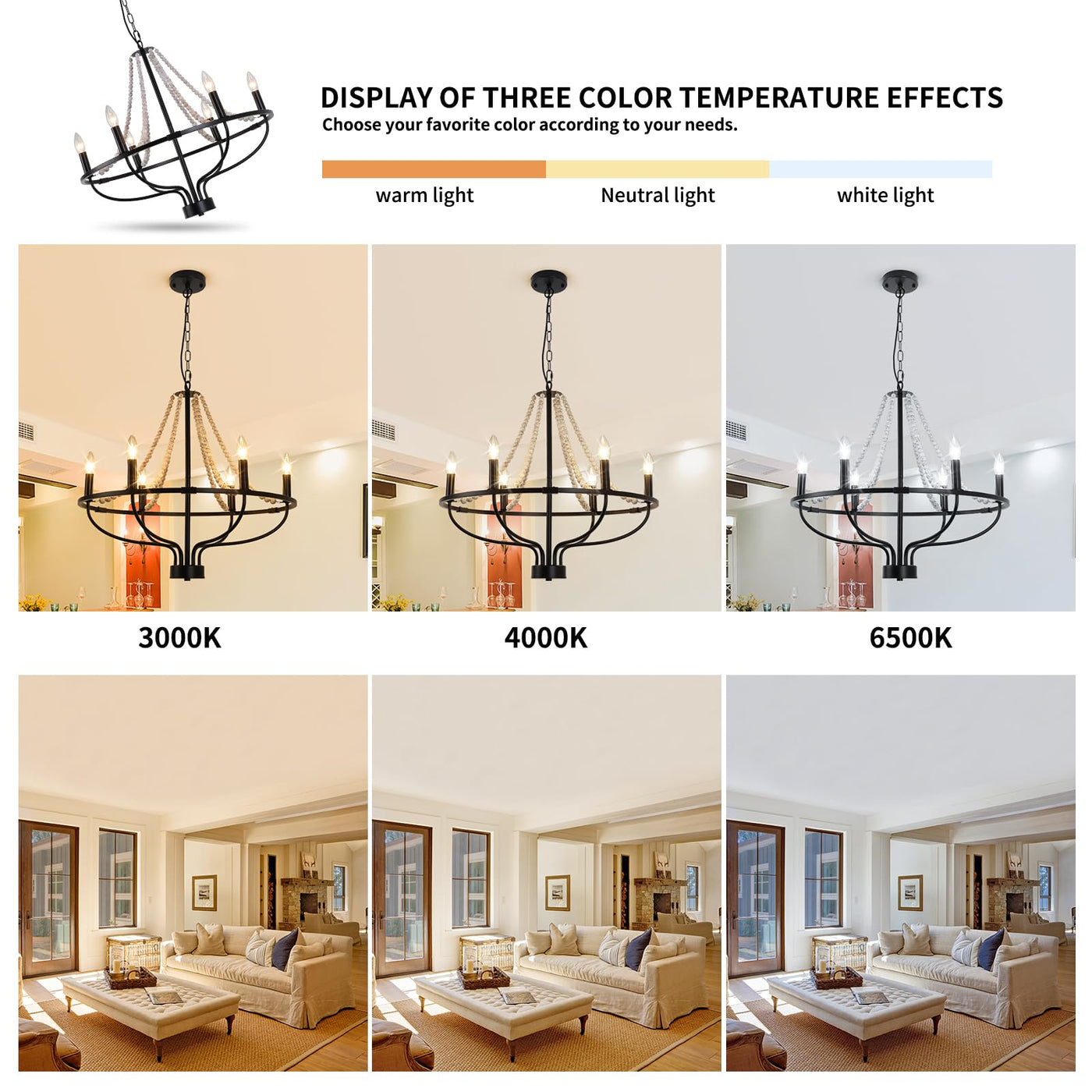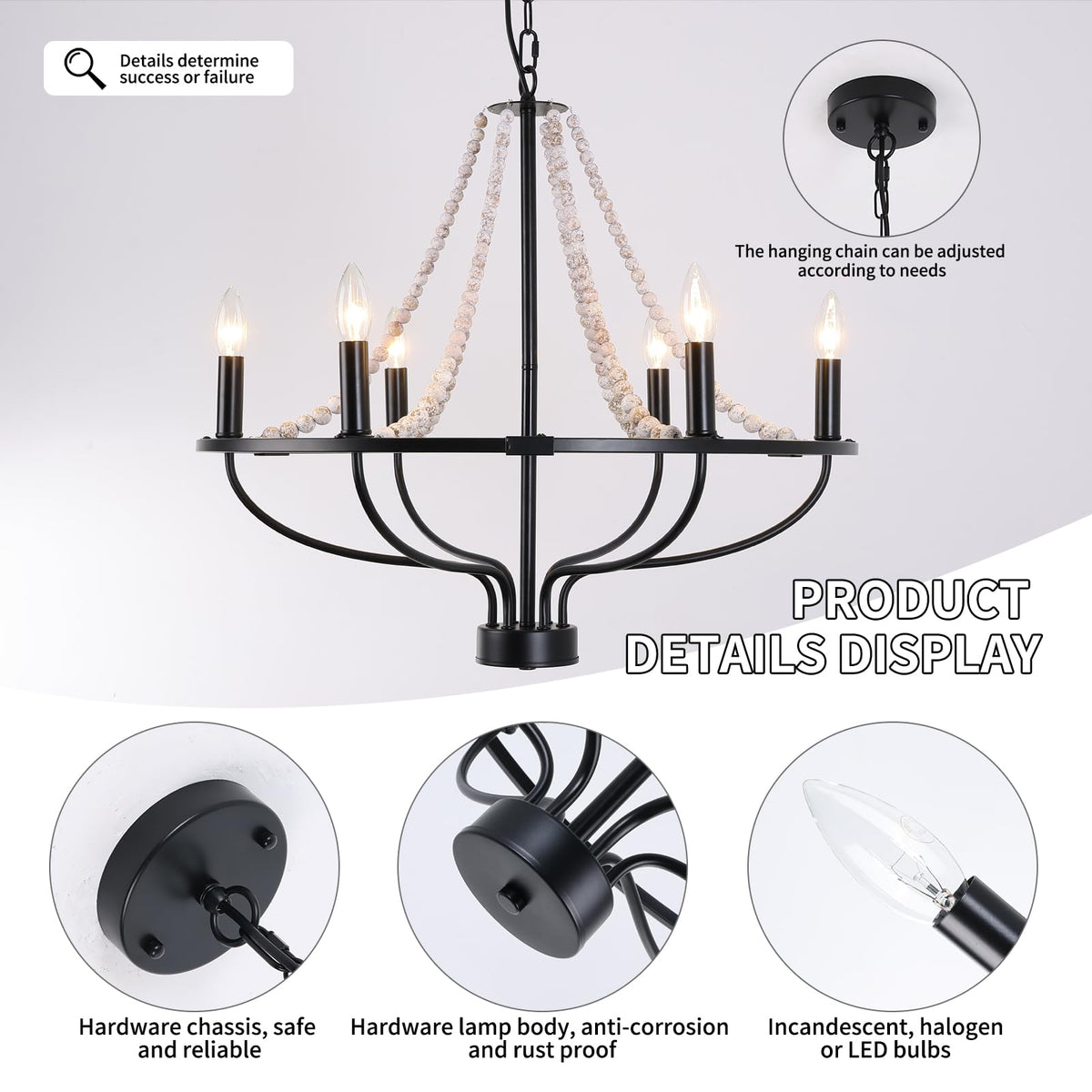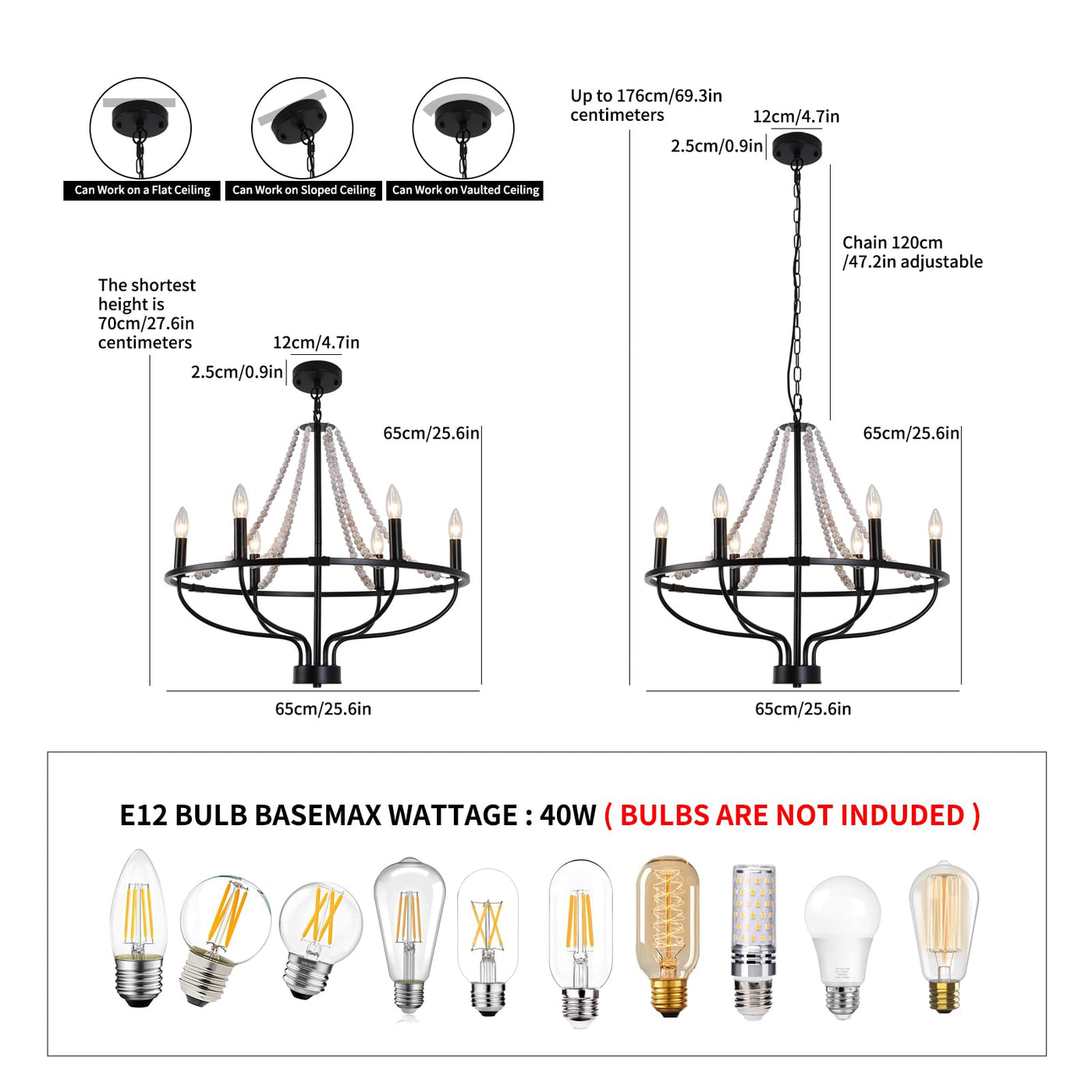 Specification Retro Chandelier Size: Chassis: 4.72*0.98 Inches (12*2.5 Cm) Light Body: 25.6*25.6*22.04 Inches (65*65*56 Cm) Adjustable Sling: 47.24 Inches/120 Cm Material: Metal, Wood Light Source: E12 Bulbs,Like Led, Halogen, Edison, Cfl, Etc Power: 40W*6 Voltage: 110-120V Colour: Black Craftsmanship: Hand-Painted Style: Retro, Elegant Applicable Area: 15-20 M Feature Powerful Brightness: The 40W Chandelier Has A Good Lighting Design, Which Can Improve The Comfort Of The Space. High-Quality Materials: The Lamp Body And Chassis Are Made Of High-Quality Metal, And The Wood Beads Are Made Of High-Quality Wood, Which Has Good Sturdiness And Durability. Compatible With Dimmable Bulbs: This Dining Room Light Fixtures Over Table Is Dimmable If Working With Dimmable Bulbs And Compatible Dimmer Switch(Not Included Also). Adjustable Length Of Hanging Wire: The Length Of The Lifting Chain Can Be Adjusted, Which Can Meet Your Height Needs In Different Scenarios And Actual Situations. Elegant Black Appearance: The Black Chandelier Is A Fashionable And Classic Lighting With A Simple And Sophisticated Appearance, Which Can Be Matched With A Variety Of Decorative Styles.