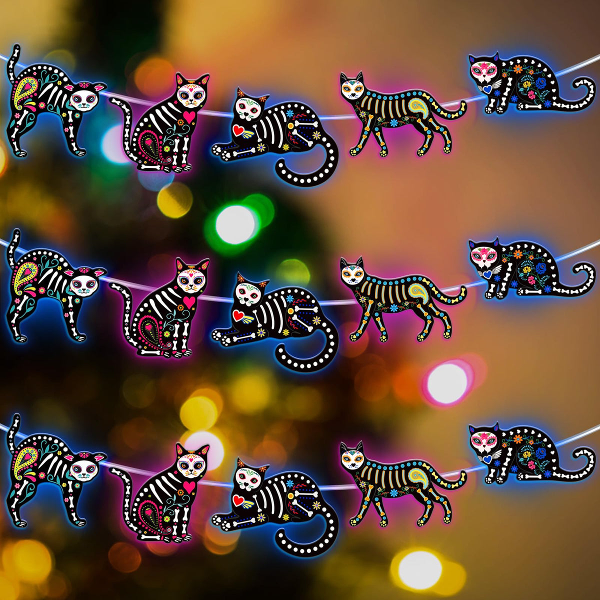 Features: The Dia de los Muertos light is made from quality plastic material that ensures durability, can withstand long term use. Not only is the decorative string light a festive addition to your Halloween decor, but it also serves as a holiday gift for friends and family. Moreover, it can even serve as photo props for your Halloween themed family photos. Specifications: Material: plasticLight color: blue and purpleSize: approx. 10 ft/ 3 meters long eachPackage includes: 1 x Halloween skull cat string lightNotes: Manual measurement, please allow slight errors on size. The color may exist a slight difference due to different screen displays. Winding risk may exist, please keep our product away from children.