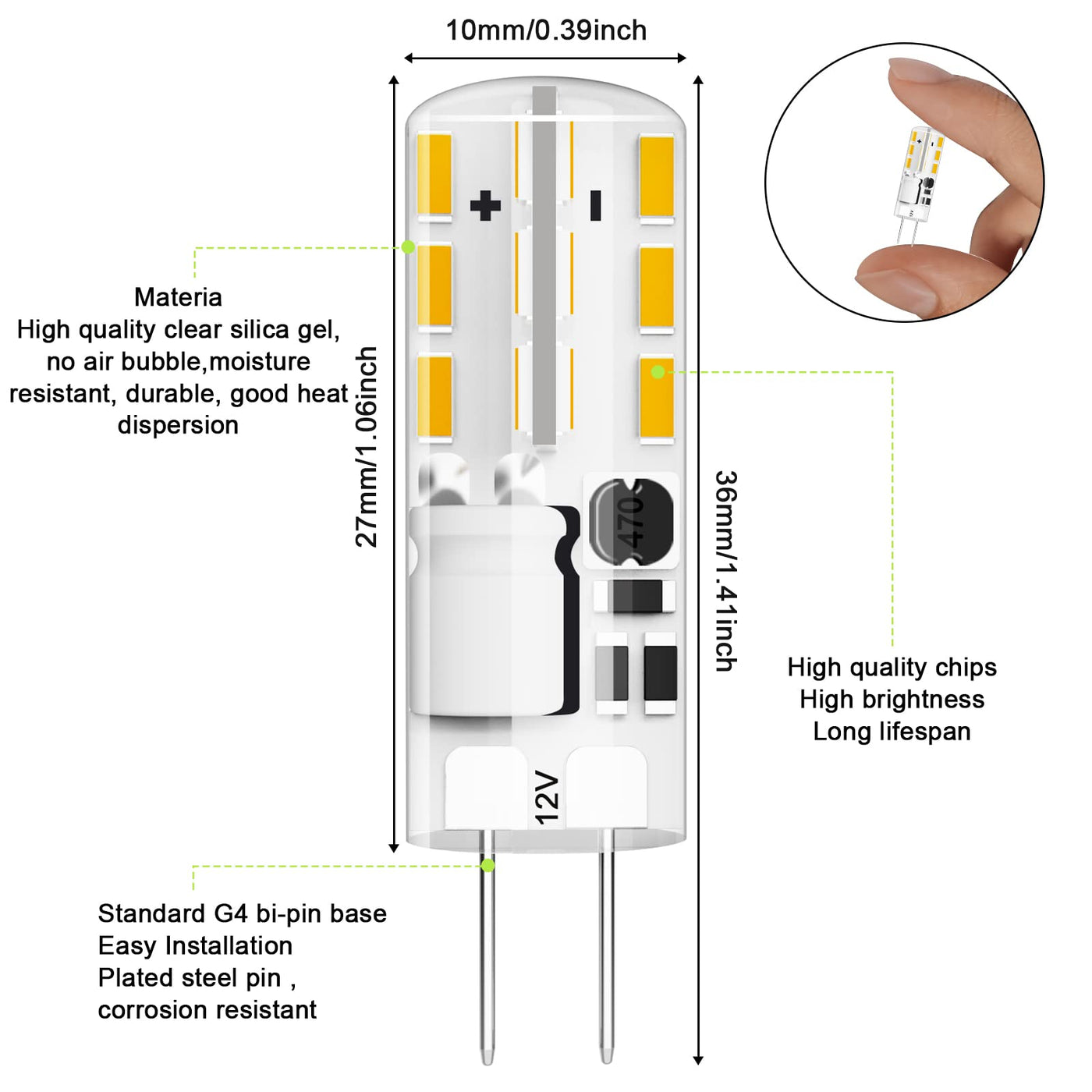 Specifications: Dimmable: No Power: 1.5W (10w halgoen equivalent) Lumen: 135LM Base: G4 bi-pin base Material: Ceramic+PC Beam Angle: 360 Degrees Input Voltage(V): AC/DC 12V Colour Rendering Index (CRI): >85Ra Color Temperature(K): Warm White 3000K CAUTIONS: Please switch off the power before replacing the lamp. This G4 LED bulb is longer/bigger than traditional G4 halogen bulbs. Please must CHECK THE DIMENSIONS before purchase. This G4 led light bulb works ONLY with 12V low voltage. Please DON'T used for 120V high voltage, they will burn out. The base of Bulb DOESN'T suitable for socket with a GROOVE, Please check before buying. Please note that these bulbs are non-dimmable, please don't use them with dimmer, or the bulbs will flicker or make noise. When you turn off the LED bulbs, there maybe remain glimmer light, which is a common phenomenon and does not affect using. 100% Satisfaction Guarantee: Our G4 LED Light Bulb Comes with 2-Year Warranty Guaranteed. Email us for any query and you will get a satisfactory reply within 24 hrs.