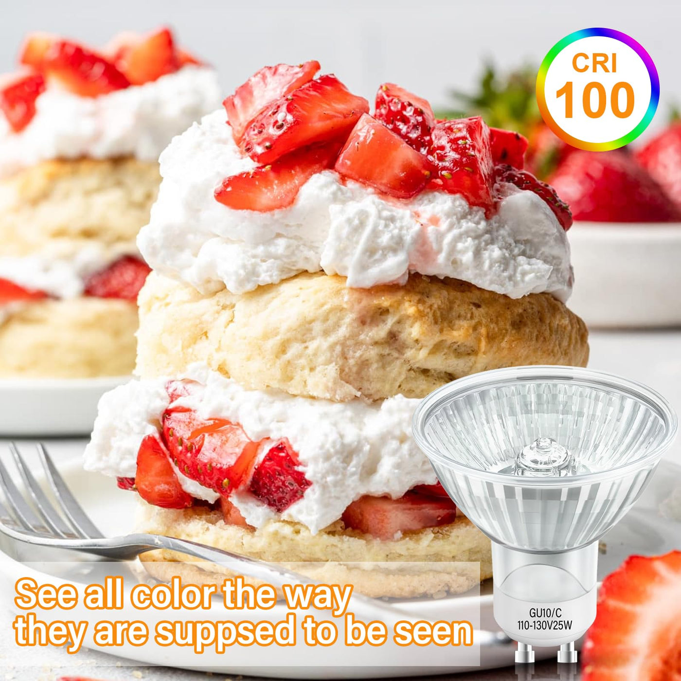 Specifications: Wattage: 50W Lumen: 500lm Input Volt: 120V Lamp Base: GU10 Dimmable: Yes Lifespan: 3000+ hours Color Rendering: CRI 100 Color Temperature: 2700K Warm White