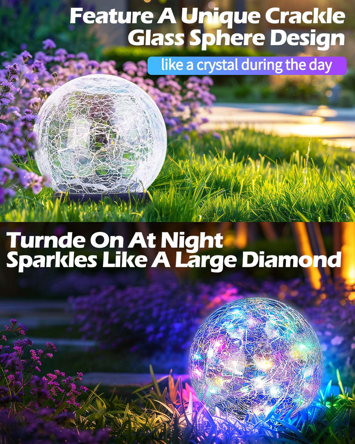 Q: How do I maintain the solar garden lights?A: To maintain the solar garden lights, ensure the solar panel is kept clean and free from debris, and periodically check the cracked glass for any damage. No need to replace batteries, as they are solar-powered.