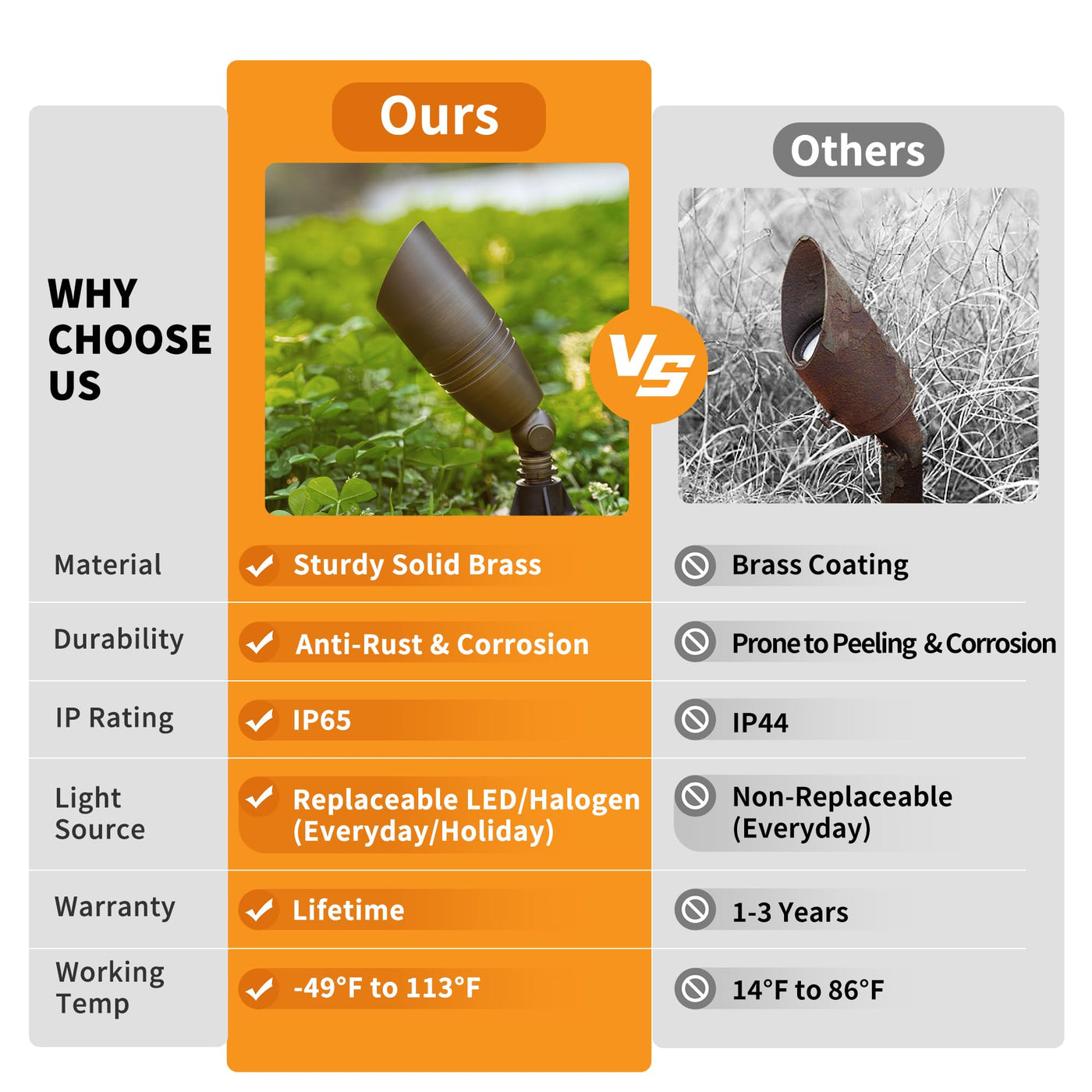 - Q: What is the wattage and type of bulbs used in the Gardenreet Die-Cast Brass Spot Light? A: The Gardenreet Die-Cast Brass Spot Light uses replaceable 5-watt MR16 bulbs, which can be either LED or halogen, providing a warm white light at 2700K.