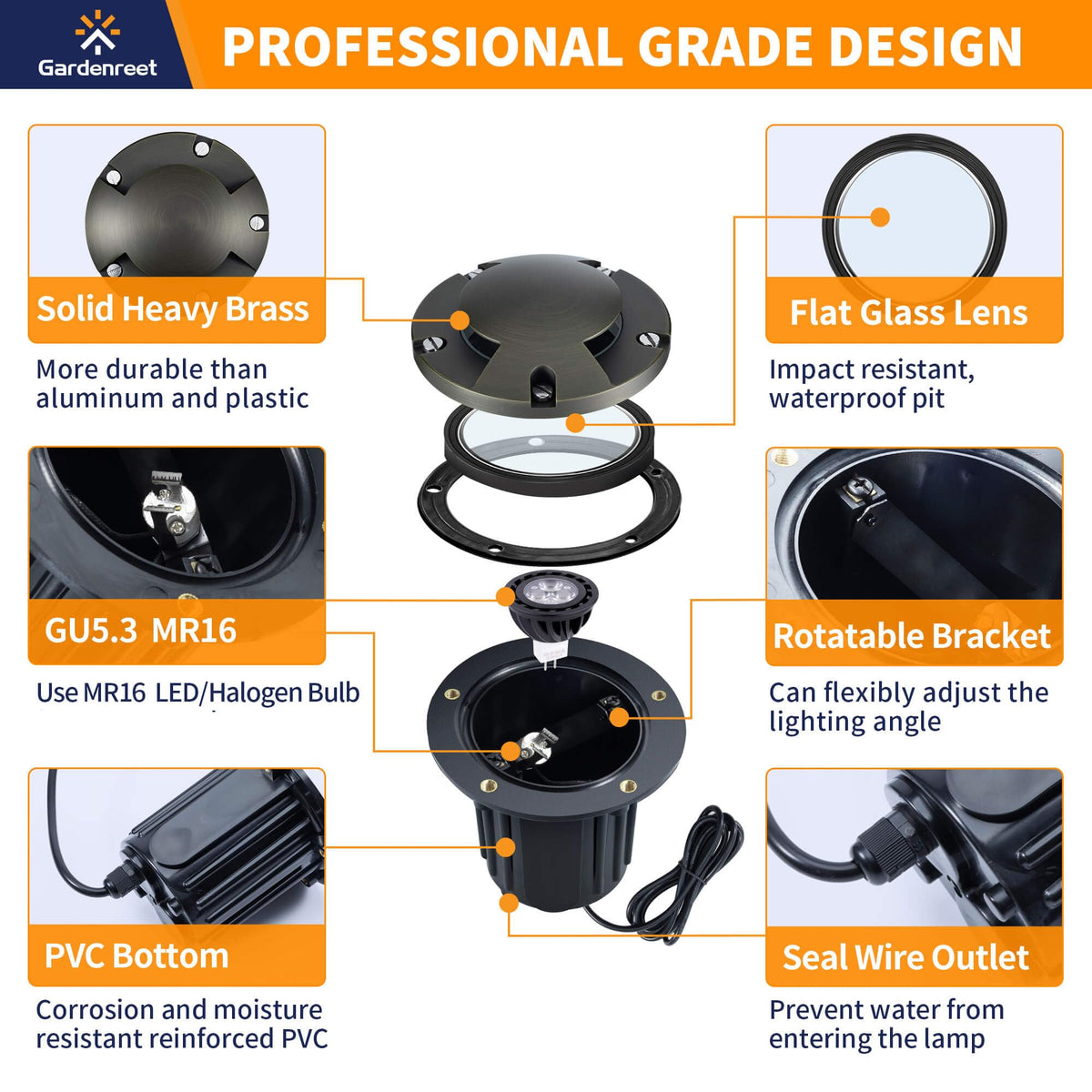 Gardenreet Brass Anti-Glare Landscape Well Lights Are All About Blending In With Style. Made From Solid Brass With A Fancy Bronze Finish, The Led Low Voltage Outdoor In Ground Lights Are Tough Enough To Handle Any Weather, From Blazing Sunshine To Freezing Snow. And Because These Led Non-Rust In Ground Well Lights Are Ip65 Waterproof, They Won'T Let A Little Rain Get In The Way Of Lighting Up Your Outdoor Space. The 5W Metal Hard Wired Low Voltage Outdoor Landscape Lights With A Pvc Sleeve Runs On A Safe, Low Voltage Of 12V, So Kids And Pets Can Run Around The Yard Without Any Worries. Plus, These Driveway Lights Are Etl Certified, Which Means They'Re Safe. Whether You Pop In An Led Mr16 Bulb For Energy-Saving Or A Halogen Bulb For That Warm Glow, These Outdoor Electric Brass Landscaping In-Ground Uplights Are Versatile. Think About How Cool Your Place Will Look With These Modern Brass In Ground Well Lights Shining On Your Path, Pathway, Walkway, Driveway, Sidewalk, Yard, Garden, Patio, Tree, Wall, Lawn, Or Backyard. They'Re Perfect For Your Yard, Making Your House The Talk Of The Street. These 12V Wired Brass Landscape Lighting Lights Up The Night With A Warm White 2700K Glow, Perfect For Outside Backyard Parties Or Just Chilling On The Porch. And These Exterior Decorative Garden Lights Are Not Just For Looks. They Keep Your Outdoor Areas Safe And Sound, Too. So, When You'Re Guiding Your Car Into The Driveway Or The Kids Are Playing Tag On The Lawn, These Hardwired, Durable Weatherproof Well Lights Will Keep Everything Bright And Clear. It'S All About That Welcoming Vibe, Making Your Outdoor Moments Even Better. These Driveway Lights And Inground Lights Are Perfect For Garden Decorations And Make Nice Housewarming Gifts.
