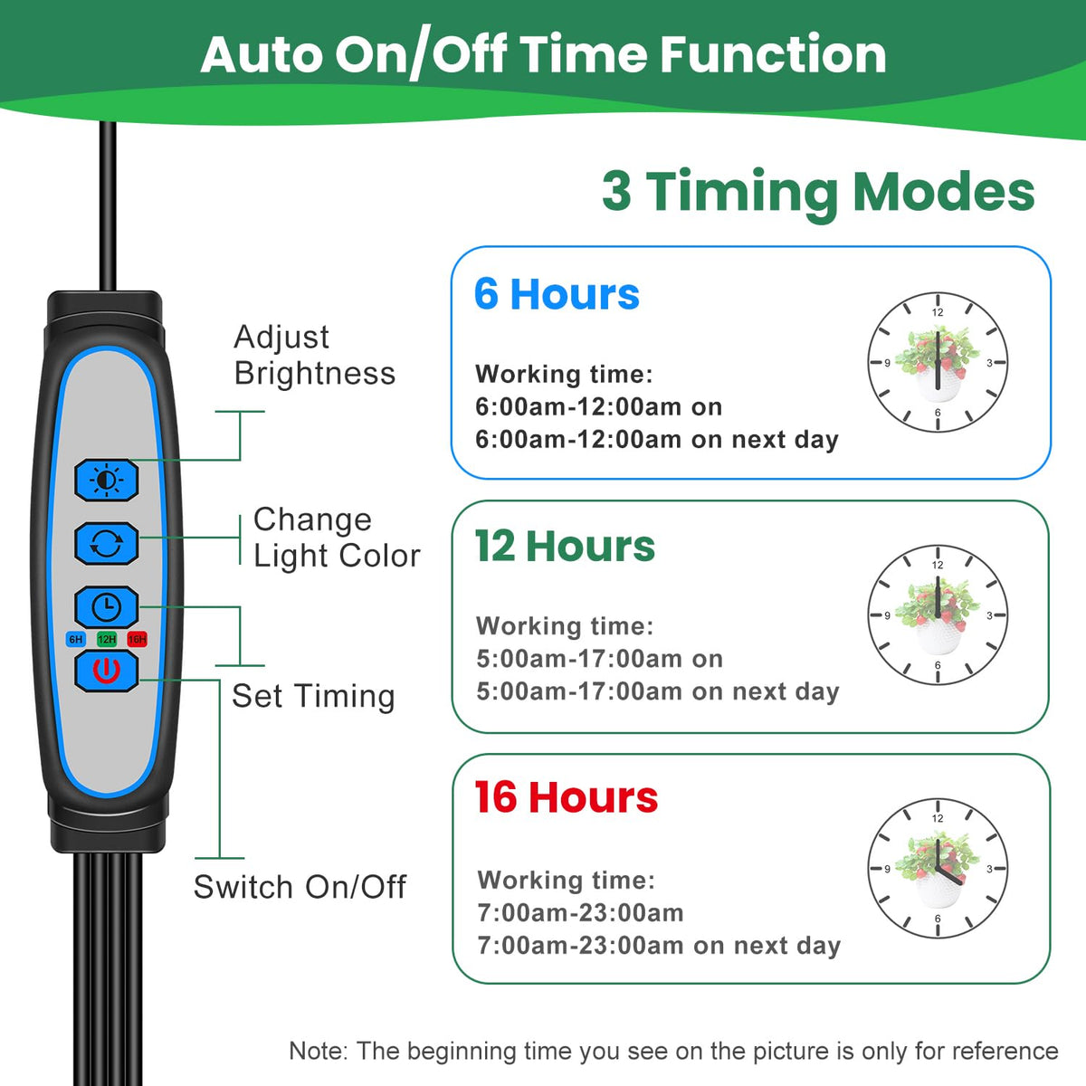 Q: How do I set the timer for the grow lights?A: The Garpsen Grow Lights feature an automatic memory timing function that allows you to set the lights to turn on and off at your desired times (6H, 12H, or 16H). This eliminates the need for manual operation and helps maintain consistent light exposure for your plants.