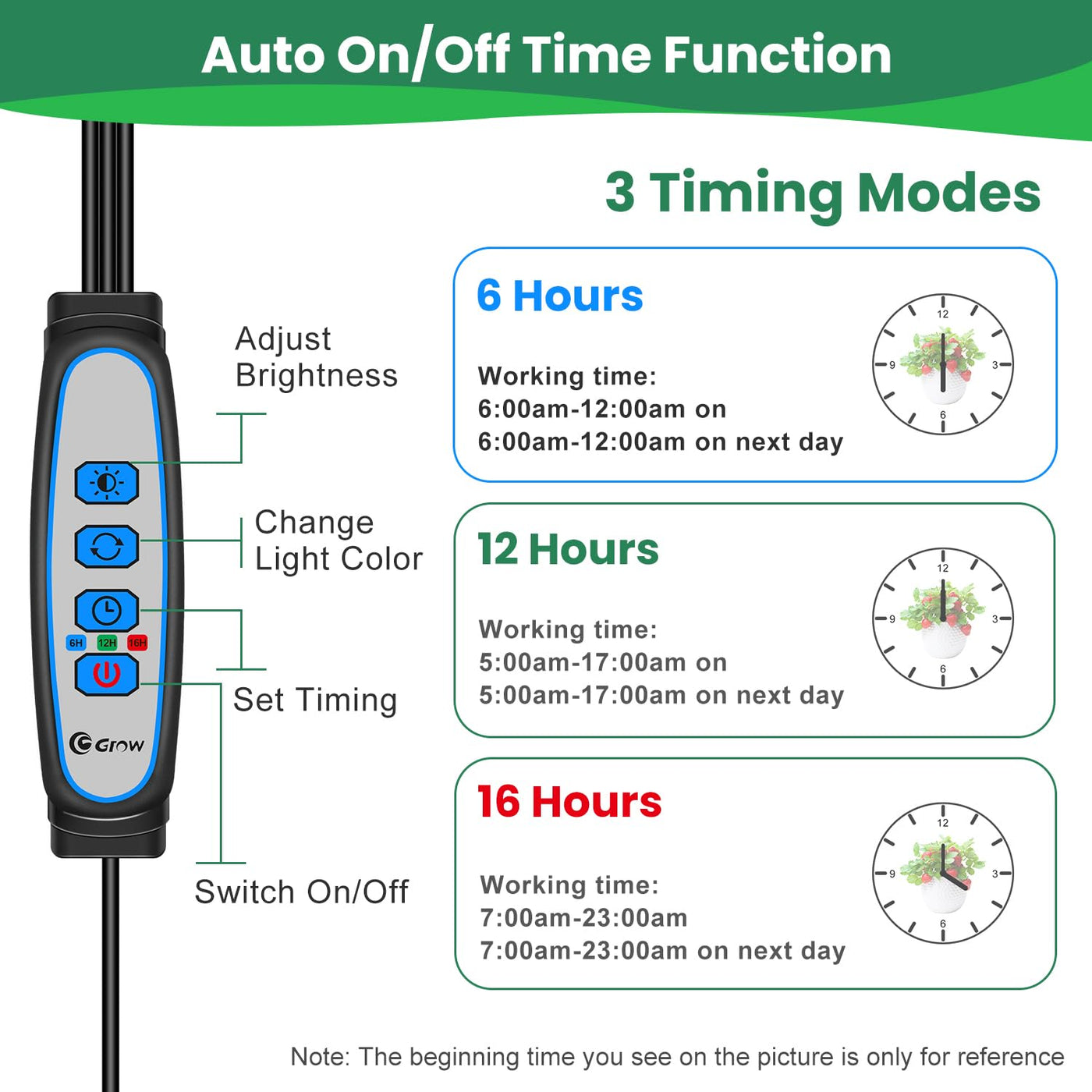 Q: How does the 6/12/16H timer function work?A: The built-in timer allows you to set the grow light to automatically turn on and off after 6, 12, or 16 hours, ensuring that your plants receive the right amount of light without the need for manual adjustments.