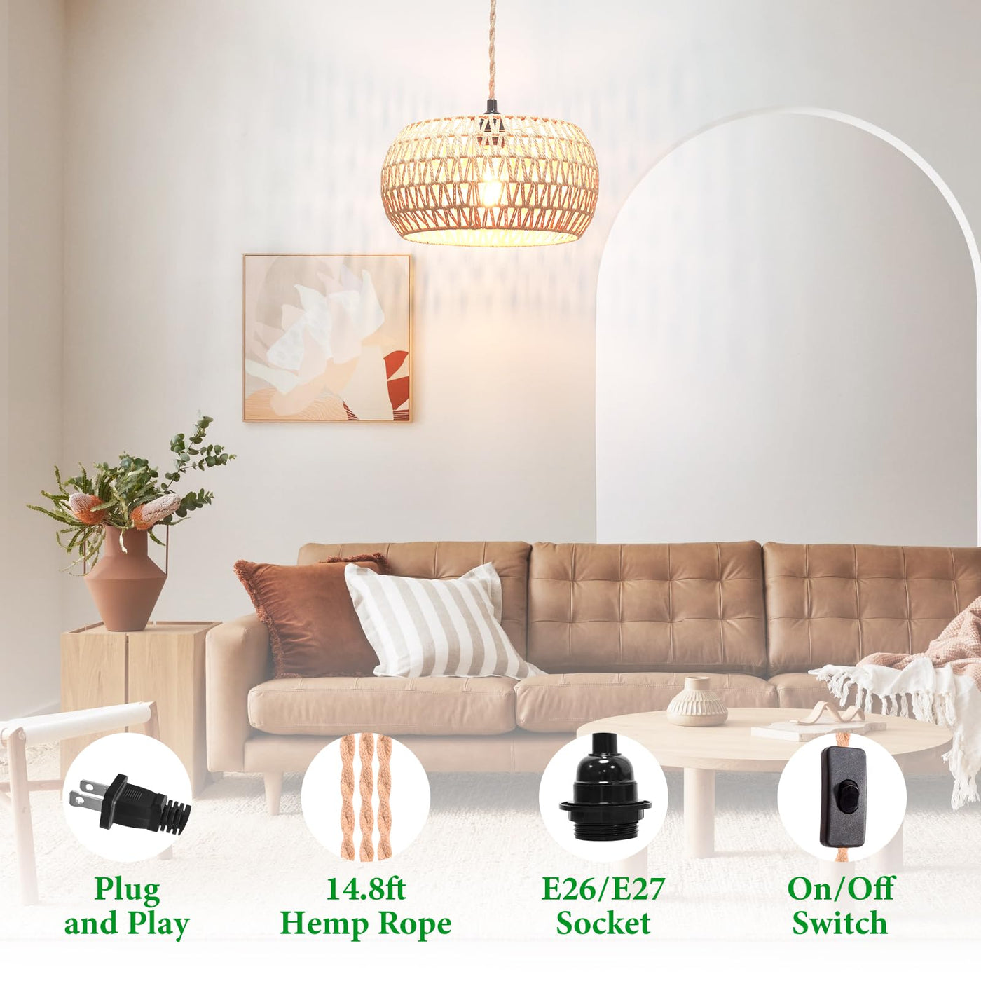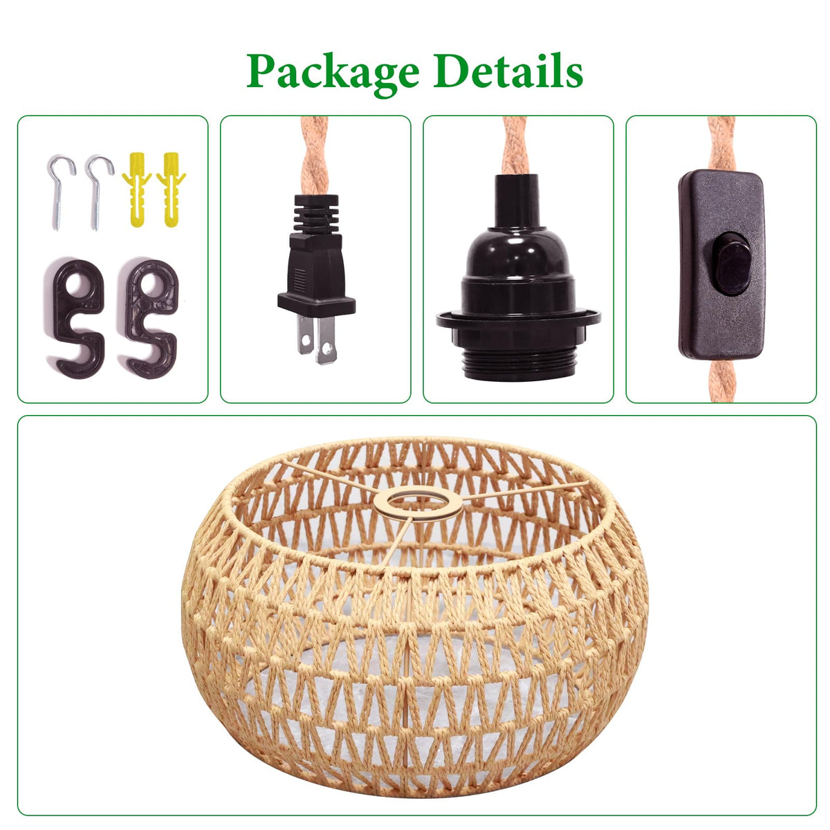 Garvot Plug In Pendant Light Rattan Hanging Lamp, Rattan Pendant Light With On/Off Switch,Rattan Woven Lampshade Hanging Lamp Pl
