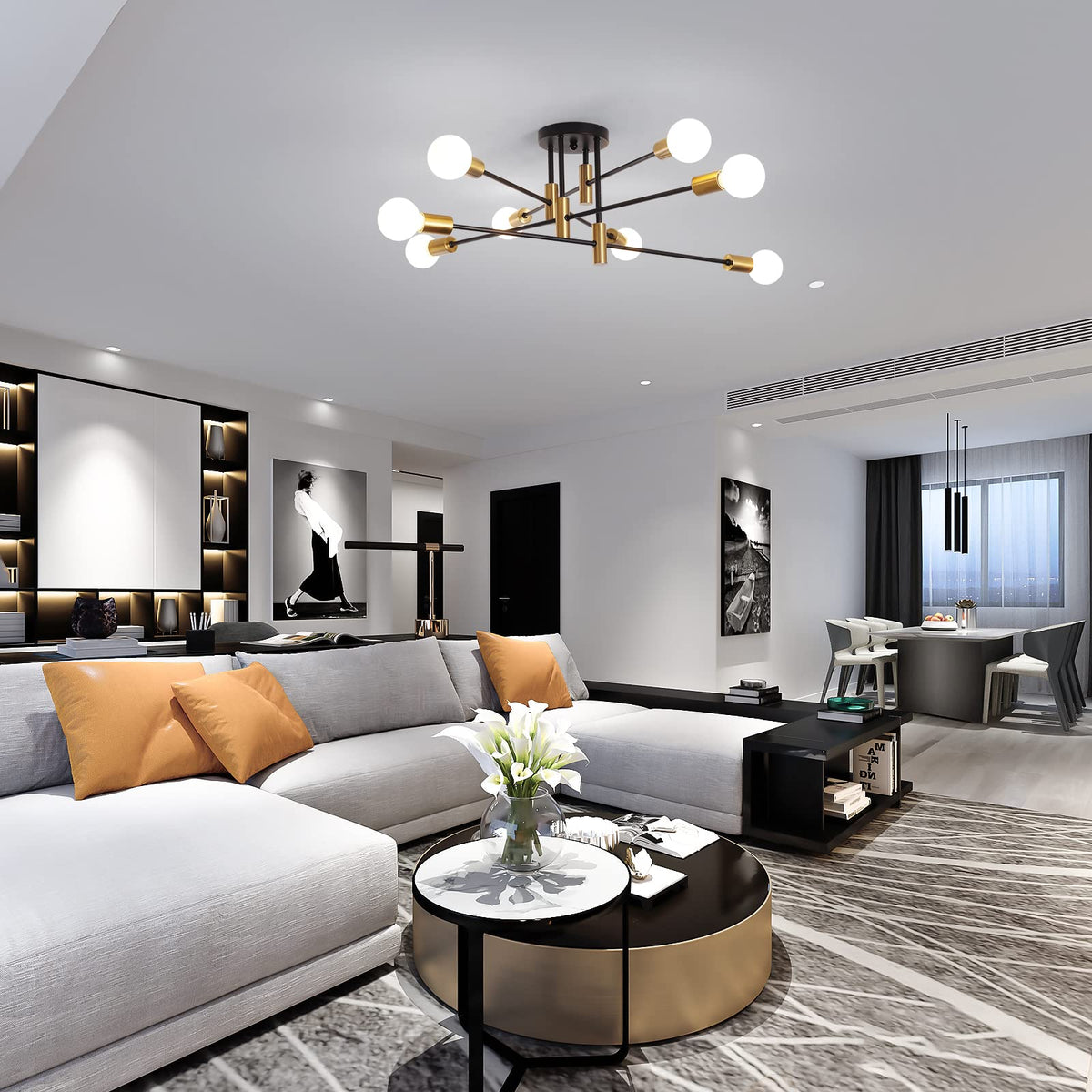 Q: What style of decor does the Garwarm 8-Light Black and Gold Ceiling Light complement?A: This mid-century modern ceiling light fixture is designed to enhance various decor styles, particularly farmhouse and industrial themes. Its black and gold finish adds a touch of elegance while remaining functional and stylish.