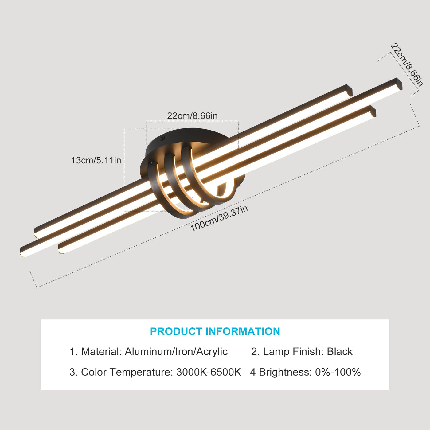 Product Highlights * This modern line style LED ceiling light with simple and stylish design, it conforms to the modern pursuit of minimalist style decoration aesthetic, add more fashionable elements for your house. * LED ceiling lamp is designed with eye protection, no flicker, no infrared or ultraviolet radiation, protects your eyes from harsh and glaring lights. It can be used for reading, sleeping, and other activities. * LED are 90% high-effective than traditional incandescent bulbs, will save a lot on your power bill. Specifications: Style: Modern/Contemporary Body Material: LED Chips +Aluminum + pvc Finish: Powder coating Fixture color: Black Dimension:L39.37 x W8.66 x H 5.12 Light Color: cold white, natural light, warm light(3000K-6500K) Color Rendering Index(CRI): >80 Lumen: 1800lm Wattage: 24W Input Voltage:110V Bulb Type : 24W LED bulbs.(Bulbs Included) Application area: 10?-20? Dimmable or Not: Dimmable Mount Type: Flush Mounted Average Lifespan: 50000 Hours Package Include: 1 x Ceiling Light 1 x Remote Control 1 x Instruction Warm Tips: Before installing the product, be sure to cut off the power supply, operate it under the premise of ensuring safety, or ask a professional electrician to install it. If you have any questions, Please to email us, we are always at your service.