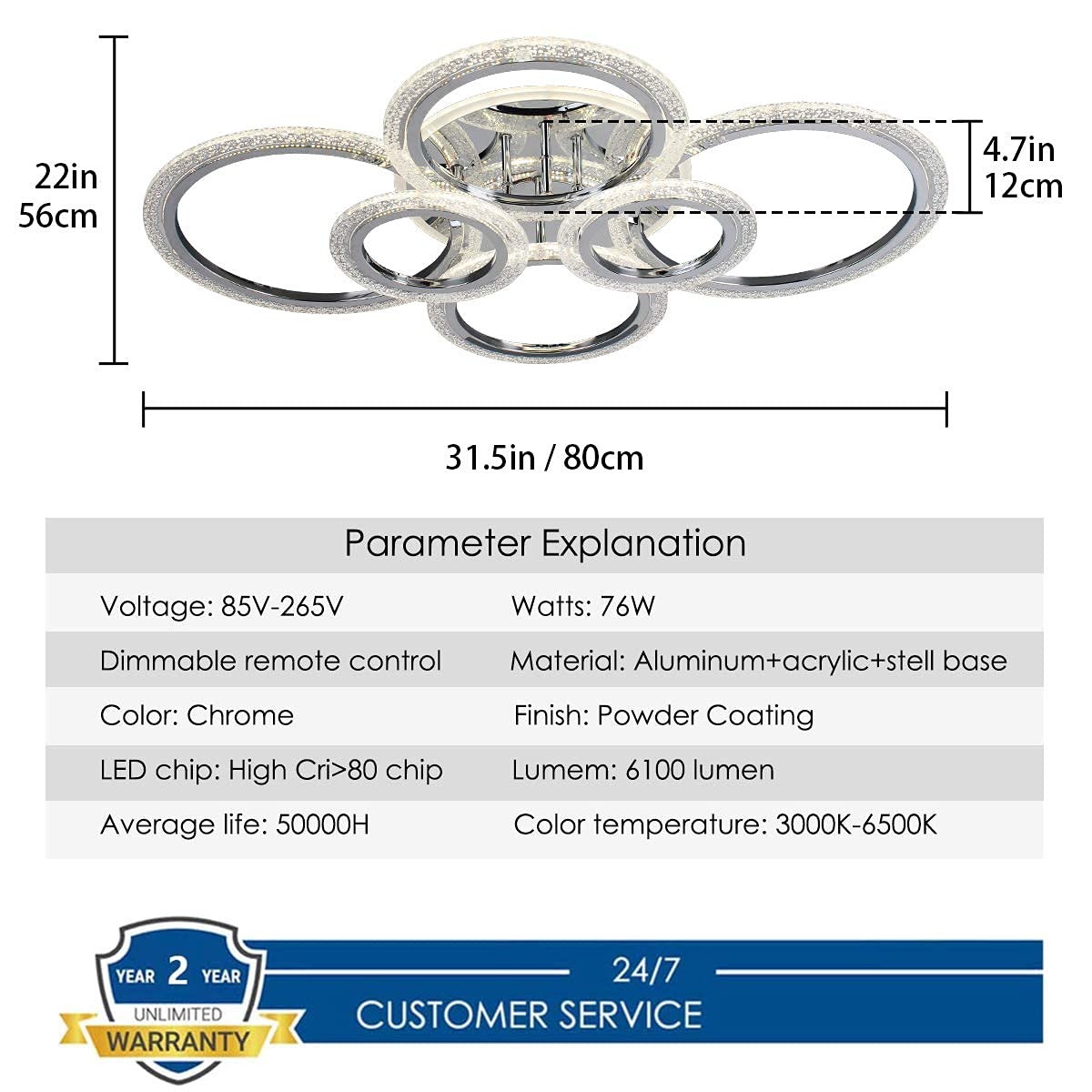 Garwarm Modern LED Ceiling Light Fixture, 76W Dimmable Chandelier, 6-Round, Chrome, Model TGZL-6003N-300-6-Chrome