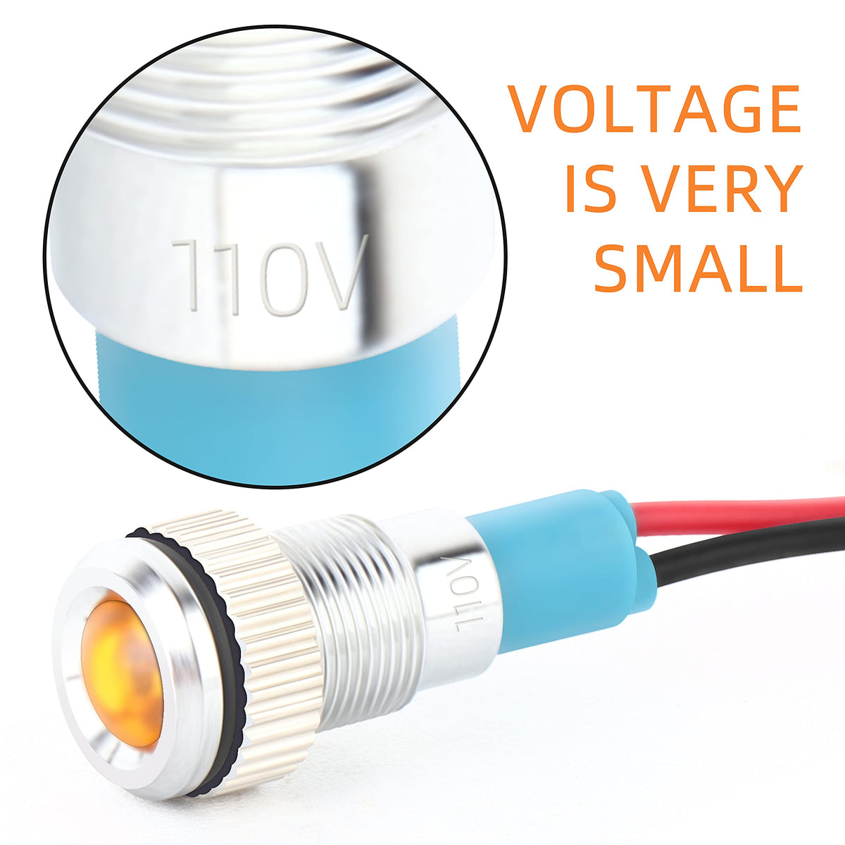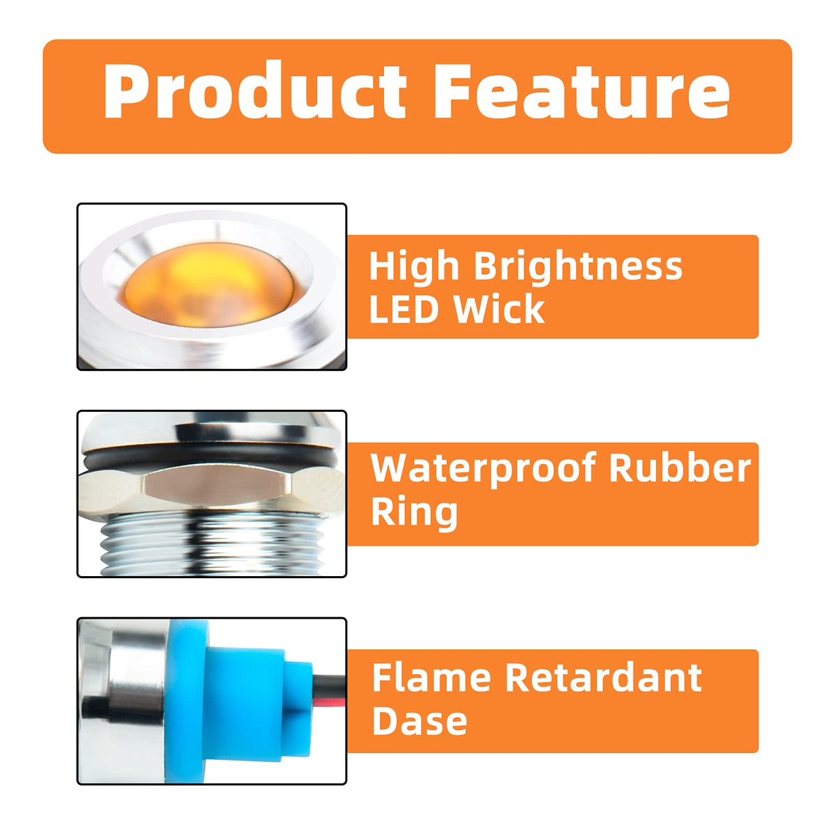 PRODUCT FEATURE 1.Rated Voltage: AC/DC 12 Volt; Mounting Hole Diameter: 12mm; Cable Length: 150mm / 6.00 inch 2.Product Features:Waterproof Rating: IP65; Service Life: 10000 Hours; Body Material: Chrome Plated Brass 3.Easy to Use:Energy saving and low maintenance cost. Flush mount for easy connection and strong conductivity. Simply drill a hole and install with nut and washer. 4.Application Range:For use as brake light, speedometer, tachometer, gauge cluster, check engine indicator, high beam indicator, shifter lights and dashboard lights. 5.Indicator Light:These panel mount pilot lights are sure to give you a visual status cue of any indexing signal, anticipating signals, emergency signal and other indexing signals.