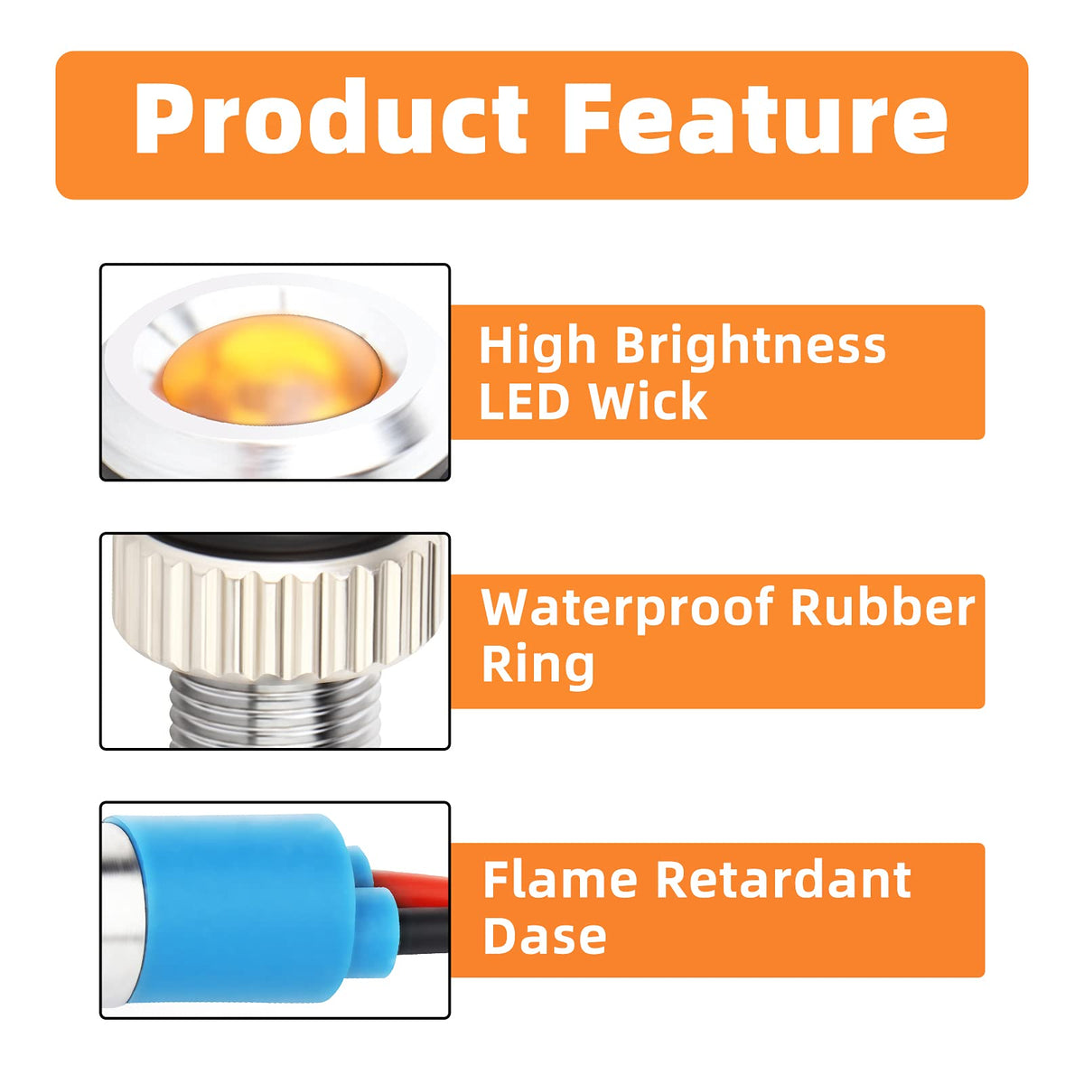 PRODUCT FEATURE 1.Rated Voltage: AC/DC 24 Volt; Mounting Hole Diameter: 8mm; Cable Length: 150mm / 6.00 inch 2.Product Features:Waterproof Rating: IP65; Service Life: 10000 Hours; Body Material: Chrome Plated Brass 3.Easy to Use:Energy saving and low maintenance cost. Flush mount for easy connection and strong conductivity. Simply drill a hole and install with nut and washer. 4.Application Range:For use as brake light, speedometer, tachometer, gauge cluster, check engine indicator, high beam indicator, shifter lights and dashboard lights. 5.Indicator Light:These panel mount pilot lights are sure to give you a visual status cue of any indexing signal, anticipating signals, emergency signal and other indexing signals.
