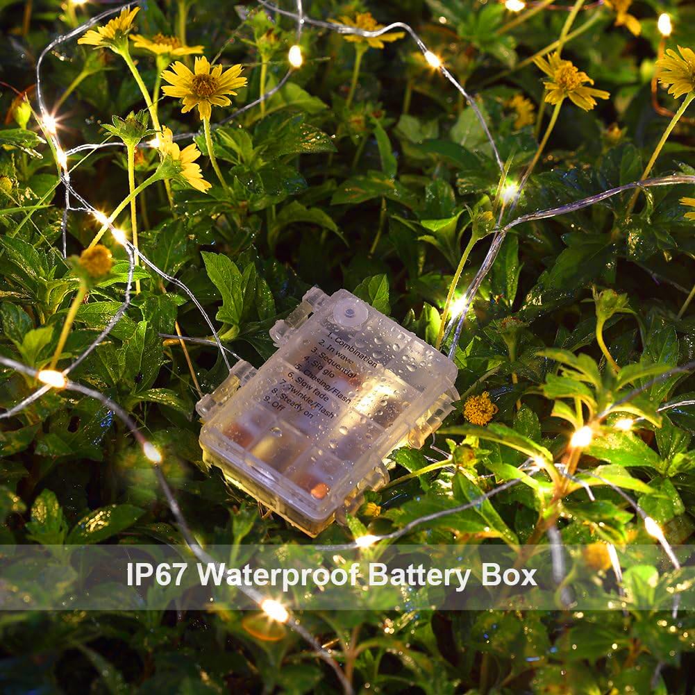 Q: Can these fairy lights be used outdoors?A: Yes, these fairy lights are designed for both indoor and outdoor use. They come with a waterproof battery box rated IP67, making them resistant to rain and snow, allowing you to decorate your garden, patio, or any outdoor space without worry.