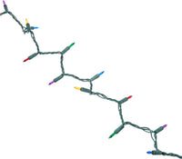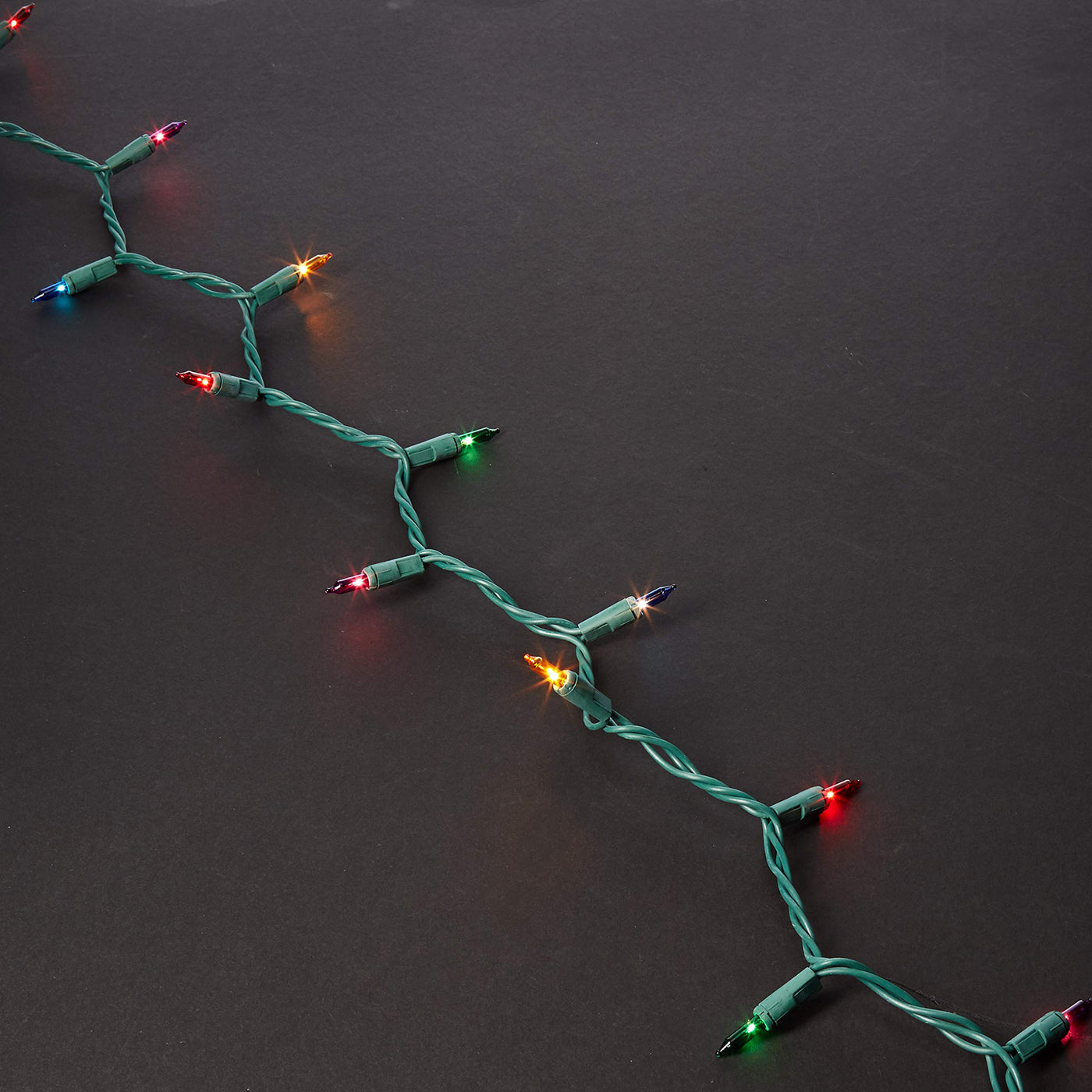 General Electric, 100 multicolor ConstantON lights with green wire. Set stays on even if a bulb becomes loose. 20.6 feet lighted length. Connect up to 5 sets. For indoor or outdoor use.