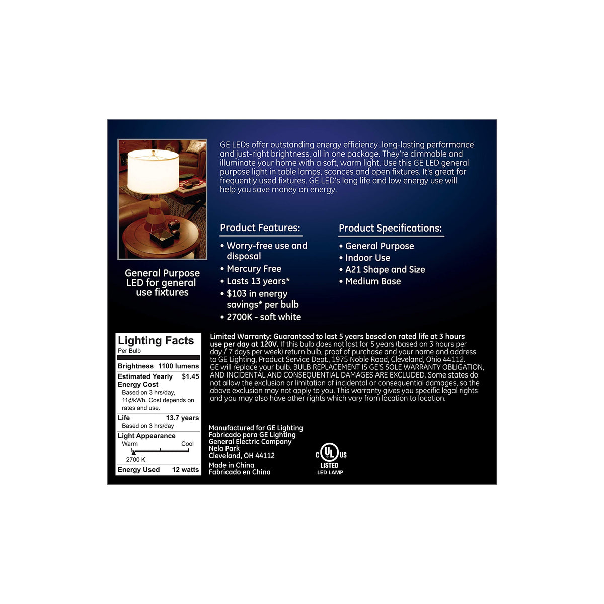 GE Soft White LED A21 General Purpose light bulbs offer outstanding energy efficiency and long-lasting performance. It offers soft, warm light. Use GE LED general purpose light in table lamps, sconces and open fixtures to replace 75-watt incandescent bulbs. It’s great for frequently used fixtures—GE LED’s long life and low energy use will help you save money on energy.
