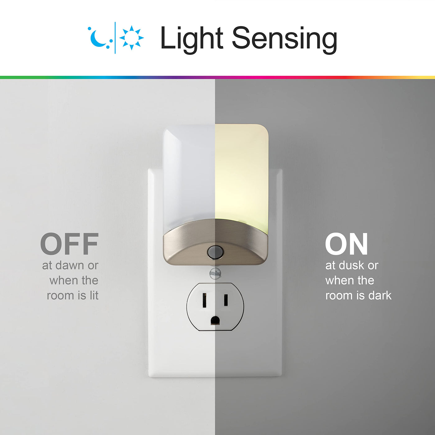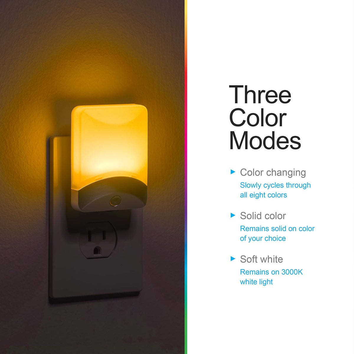 Always dream in color when you fall asleep with the GE-branded color-changing night light. The lights soft glow guides you safely through your nighttime routine and offers a variety of colorful lighting options. Choose between three different modes: solid color, color-changing and soft white. In solid-color mode, light up your dark room or hallway with one of eight vibrant colors. In color-changing mode, enjoy all nine colors as the night light slowly transitions through the entire spectrum. For normal illumination, just opt for the white mode. Theres no need to unplug the night light during the day - the lights sensor automatically turns the night light on when its dark and off when its light, helping to keep energy costs down. The night light features a contemporary design in brushed nickel and only takes up the space of one outlet, leaving the second receptacle free for use. Utilize the night light in bedrooms, staircases, hallways, bathrooms and more. Let your true colors shine with the GE-branded color-changing night light.