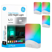 Always dream in color when you fall asleep with the GE-branded Color-Changing Night Light. The lights soft glow is perfect for evening routines or helping kids get to sleep - theres also a variety of colorful lighting options! Choose between three different modes: solid color, color-changing and soft white. In solid-color mode, light up your dark room or hallway with one of eight vibrant colors. In color-changing mode, enjoy all the colors as they slowly fade from one to the next. For normal illumination, just opt for the white light mode. Theres no need to unplug the night light during the day - the lights sensor automatically turns the night light on when the room gets dark - ON at dusk, OFF at dawn. To turn the night light off manually, simply push the button located at the base of the light. Featuring a sleek design, the compact size only takes up a single receptacle in an outlet, leaving the second free for use. Ideal in bedrooms, staircases, hallways, bathrooms and more, guide your way with the GE-branded Color-Changing Night Light.