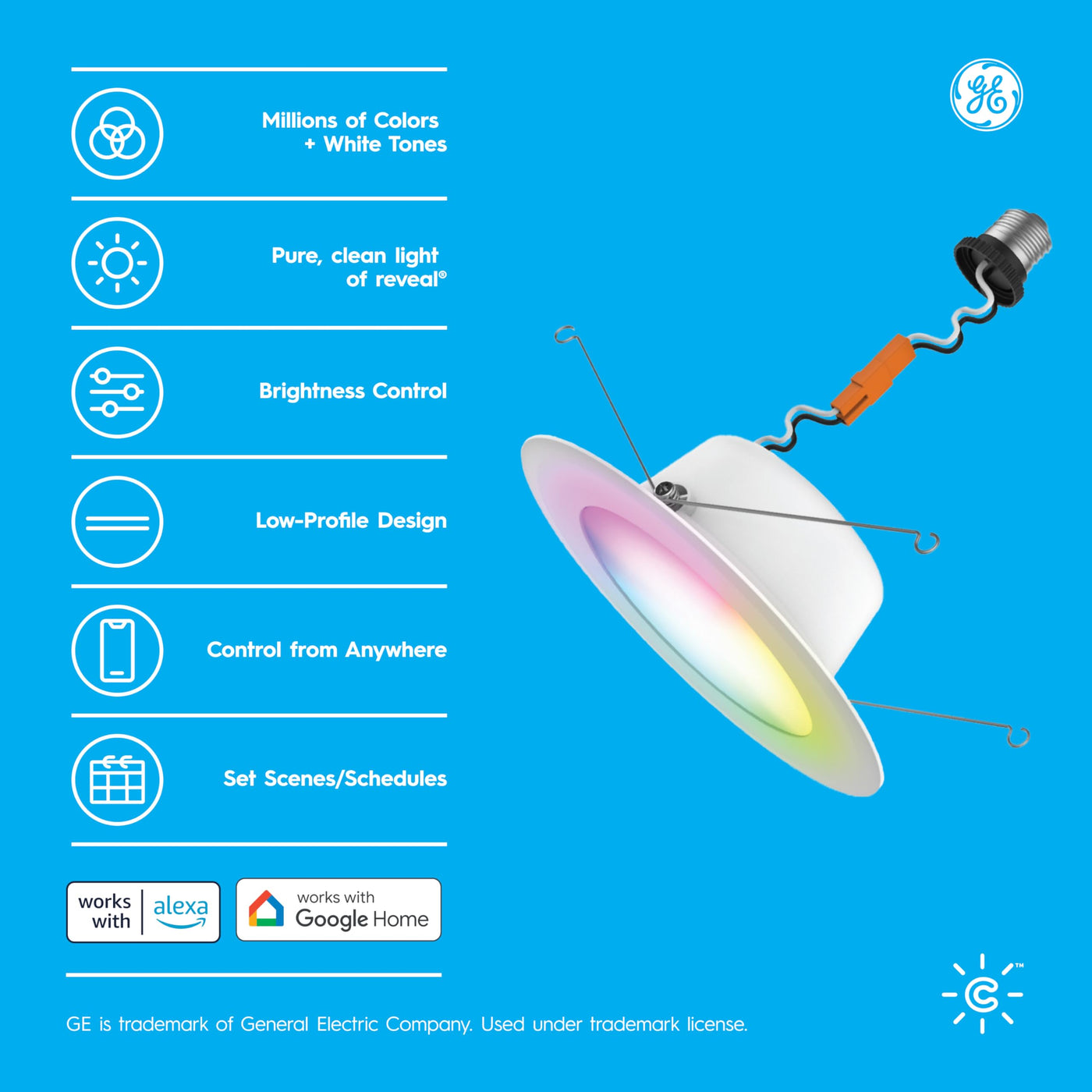 The Ge Cync Reveal Hd+ Full Color Smart Led Wafer Light Provides Enhanced Control, Scheduling, And Millions Of Vibrant Colors To Enhance Any Space - No Recessed Can Housing Needed. Select From A Wide Range Of White Color Tones From 2000K To 7000K And Pinpoint The Perfect Choice For Led Work Lights, Basement Lights, Kitchen Lights And Much More. The Tunable White Spectrum Offered By These Smart Led Lights Supports Your Sleep/Wake Cycle And Creates The Perfect Scene For Winding Down Or Waking Up. Choose From Millions Of Additional Colors With This Light To Enhance The Vibe For Parties And Holiday D Cor. The Led Color Lights Are Simple To Set Up And Work Right Out Of The Box Through The Intuitive Cync App, Powered By Savant, Which Allows For Remote Cync Light Control. Take Advantage Of Smart Lighting For Home Control And Scheduling Even When Youre Away On Vacation. Get Even More Out Of These Wifi Led Lights With Voice Control That Works With Google Home, Amazon Alexa, And Matter-Compatible Voice Assistants.