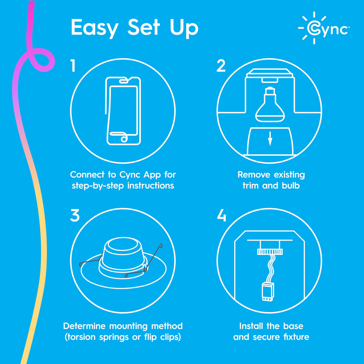 Q: How do I install the GE Cync Reveal HD+ Smart LED Downlight?A: Installation of the GE Cync Reveal HD+ Smart LED Downlight is straightforward as it requires no recessed can housing. Simply follow the included instructions to connect to your existing ceiling fixture. Ensure you have a 2.4GHz Wi-Fi connection for setup and control.