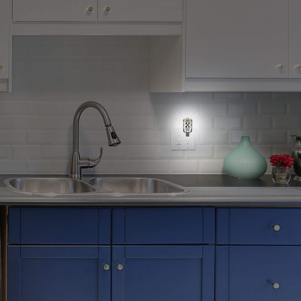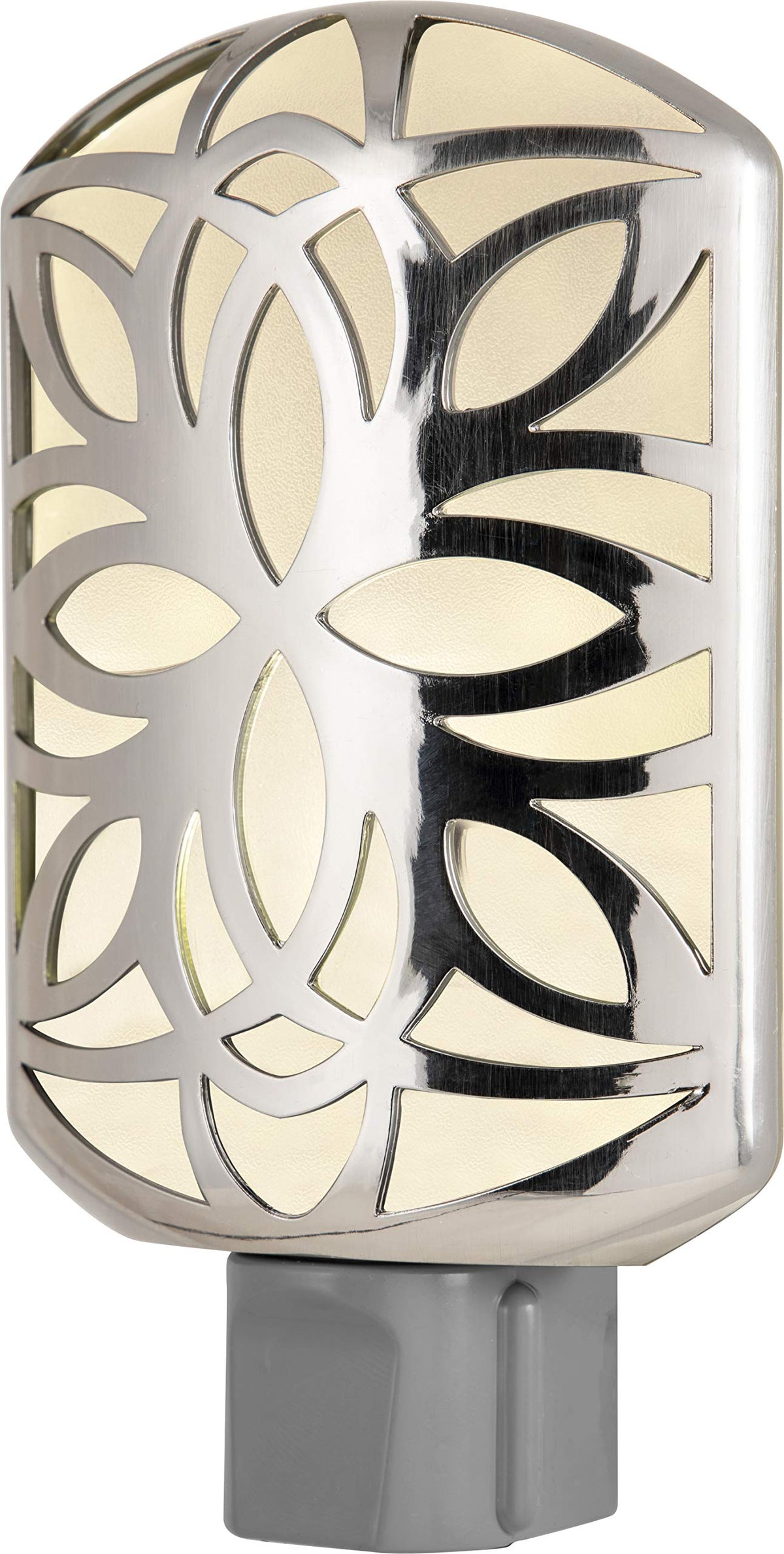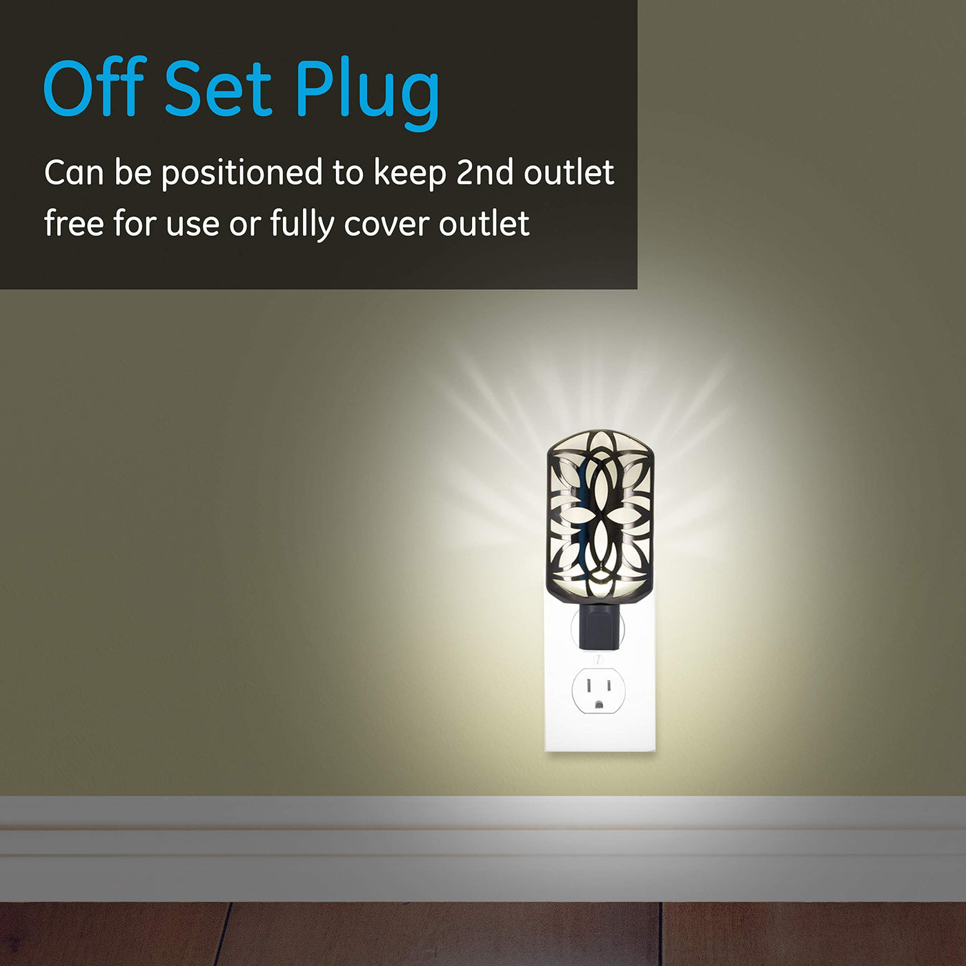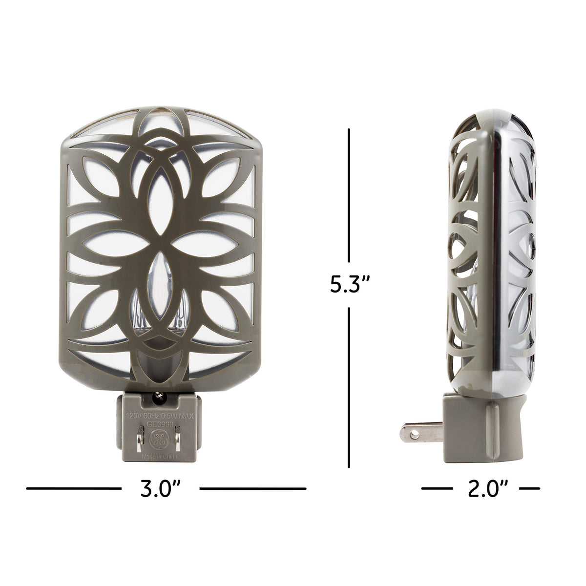 Use the GE LED D cor Night Light to light up any room with your personal style. This night light features an intricate flower design that reflects a soft flower light pattern on the wall when lit. With light sensing technology, it turns on automatically at dusk and off at dawn. The long-life LEDs mean no bulbs to replace. This energy-efficient, LED night light uses just pennies worth of electricity per year! This night light is intended for indoor use only..