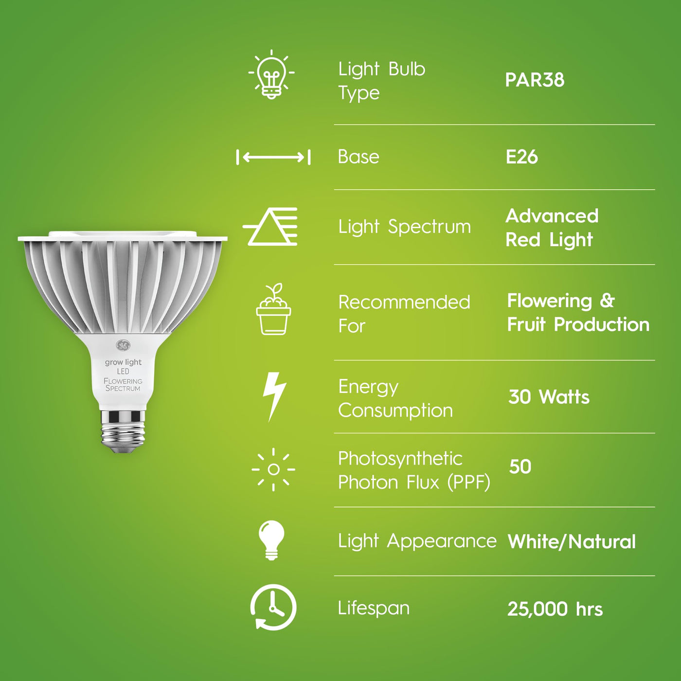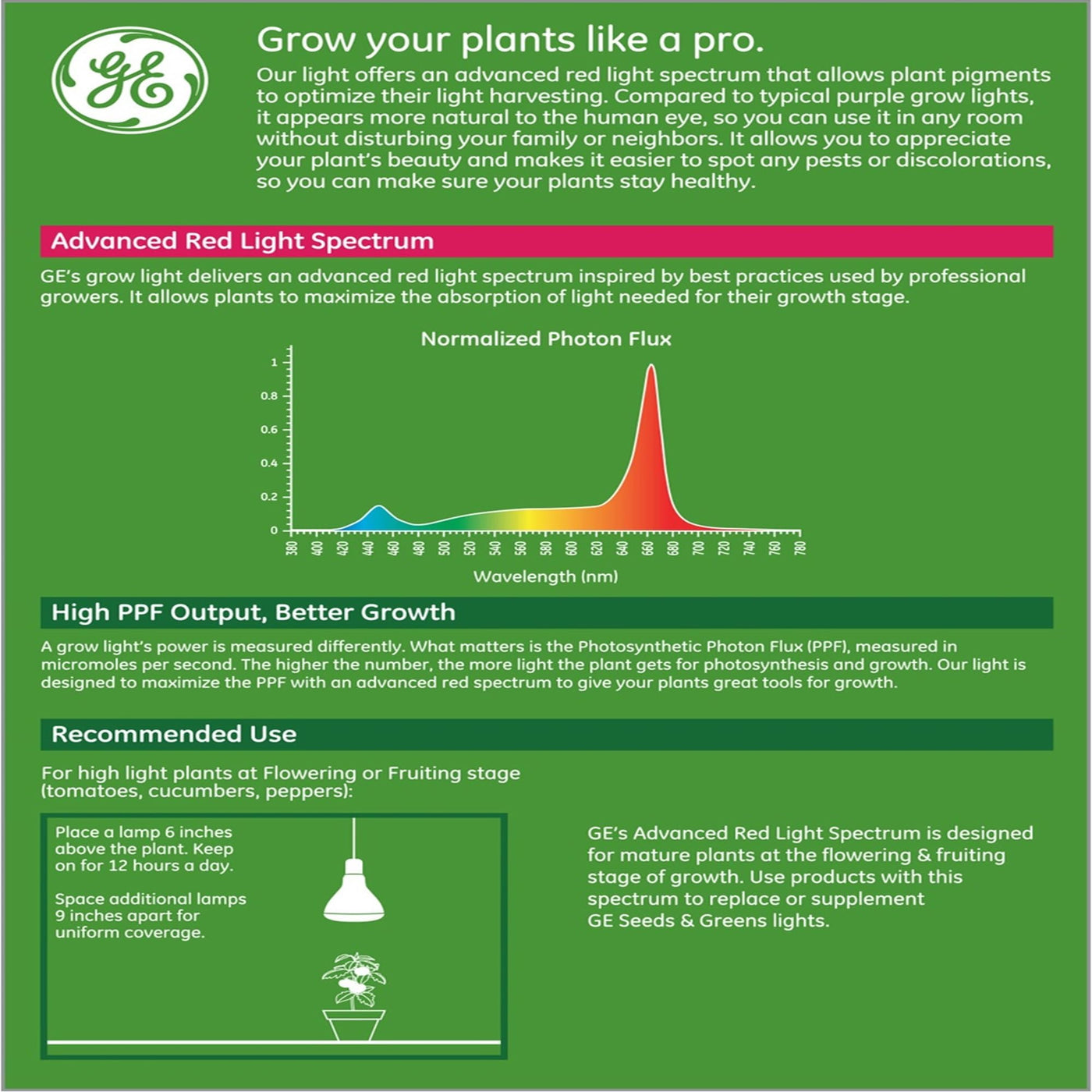 The weather-resistant GE LED Plant Grow Light for flowers and fruit is expertly crafted to support your plants throughout their growth stages. Ideal for both indoor and outdoor gardening, this advanced red light spectrum bulb is designed to optimize light harvesting, inspired by the best practices of professional growers.